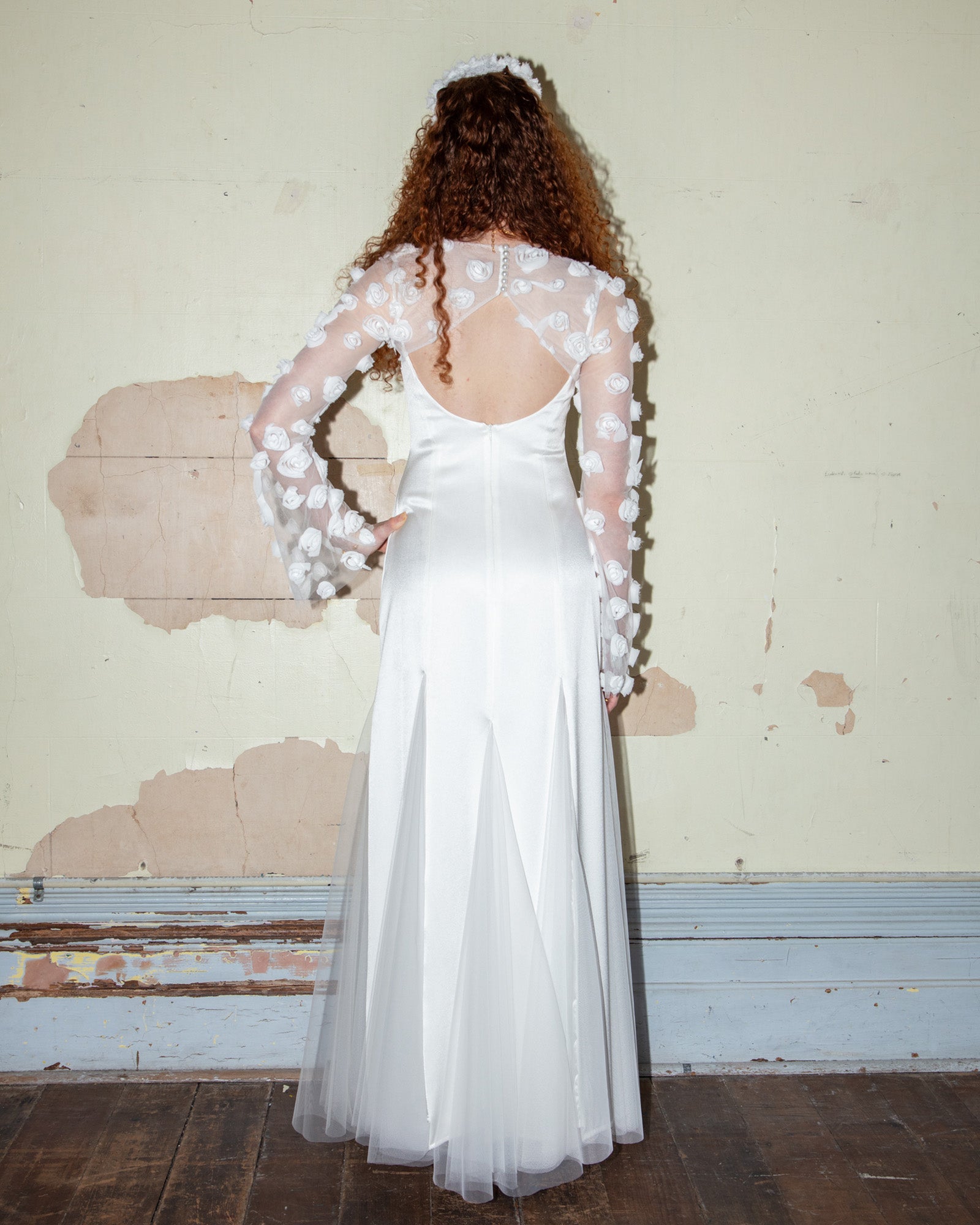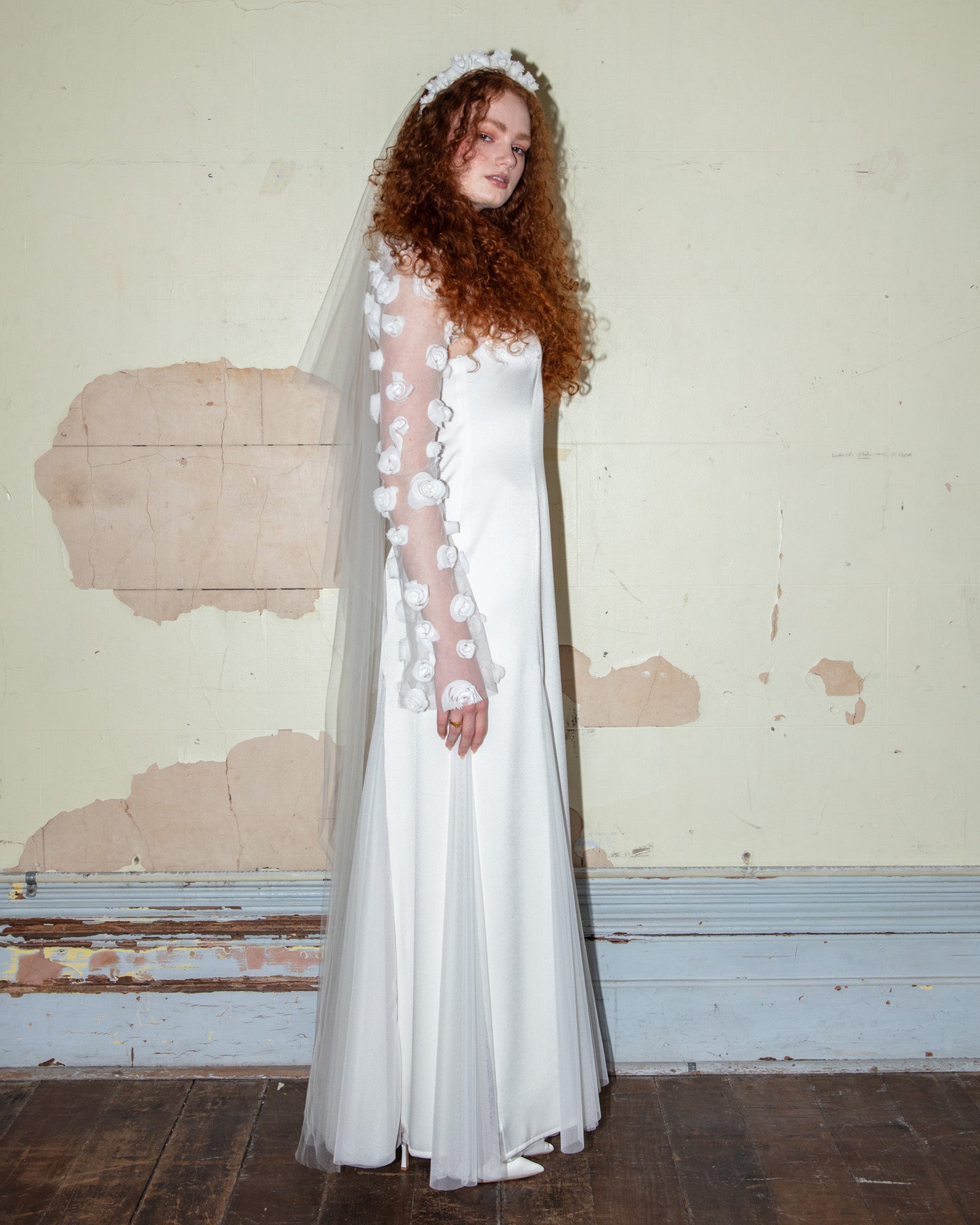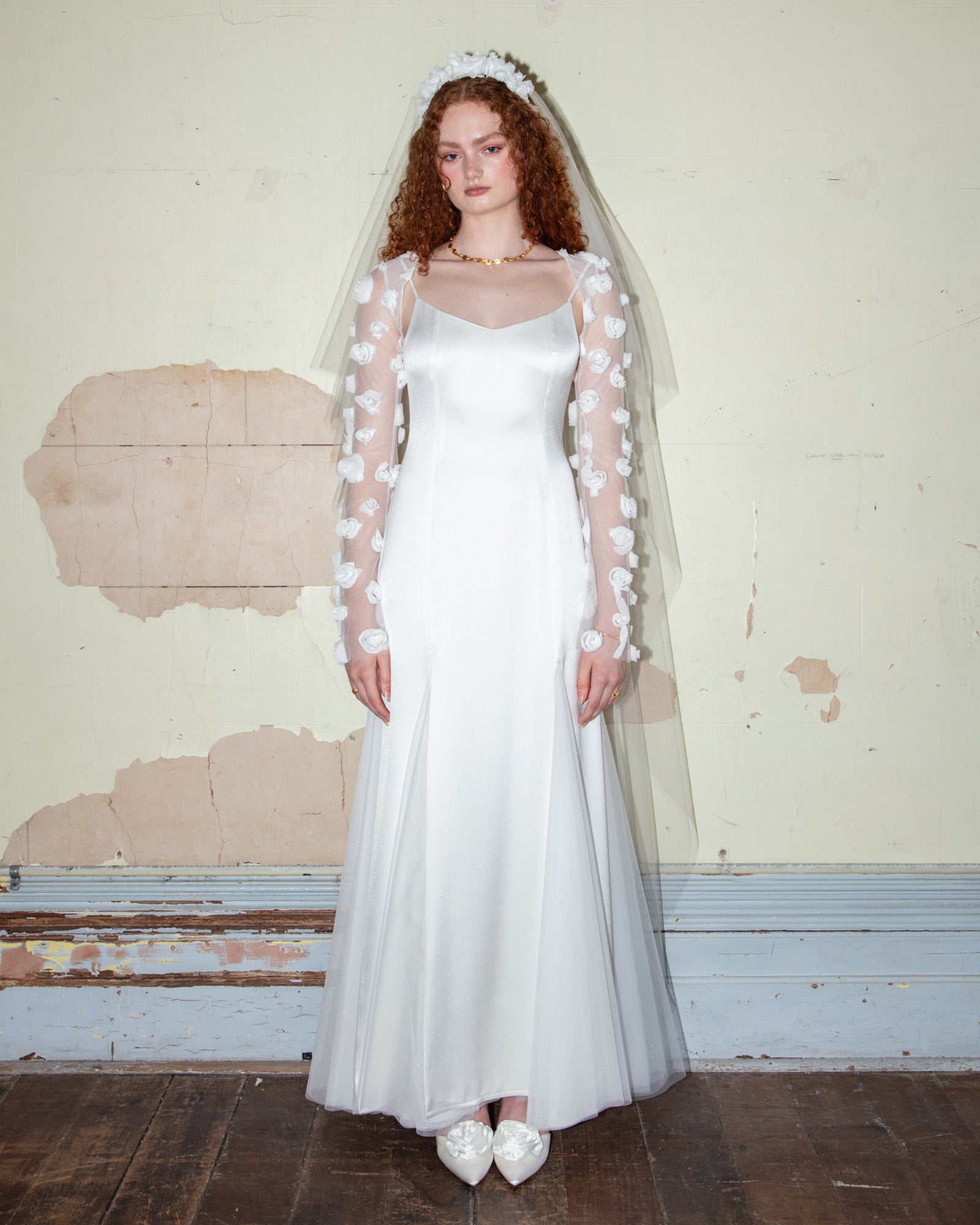 Styled here with the Emma Headband, the Yvonne Slip Dress, and the Aleisha Long Layered Veil.