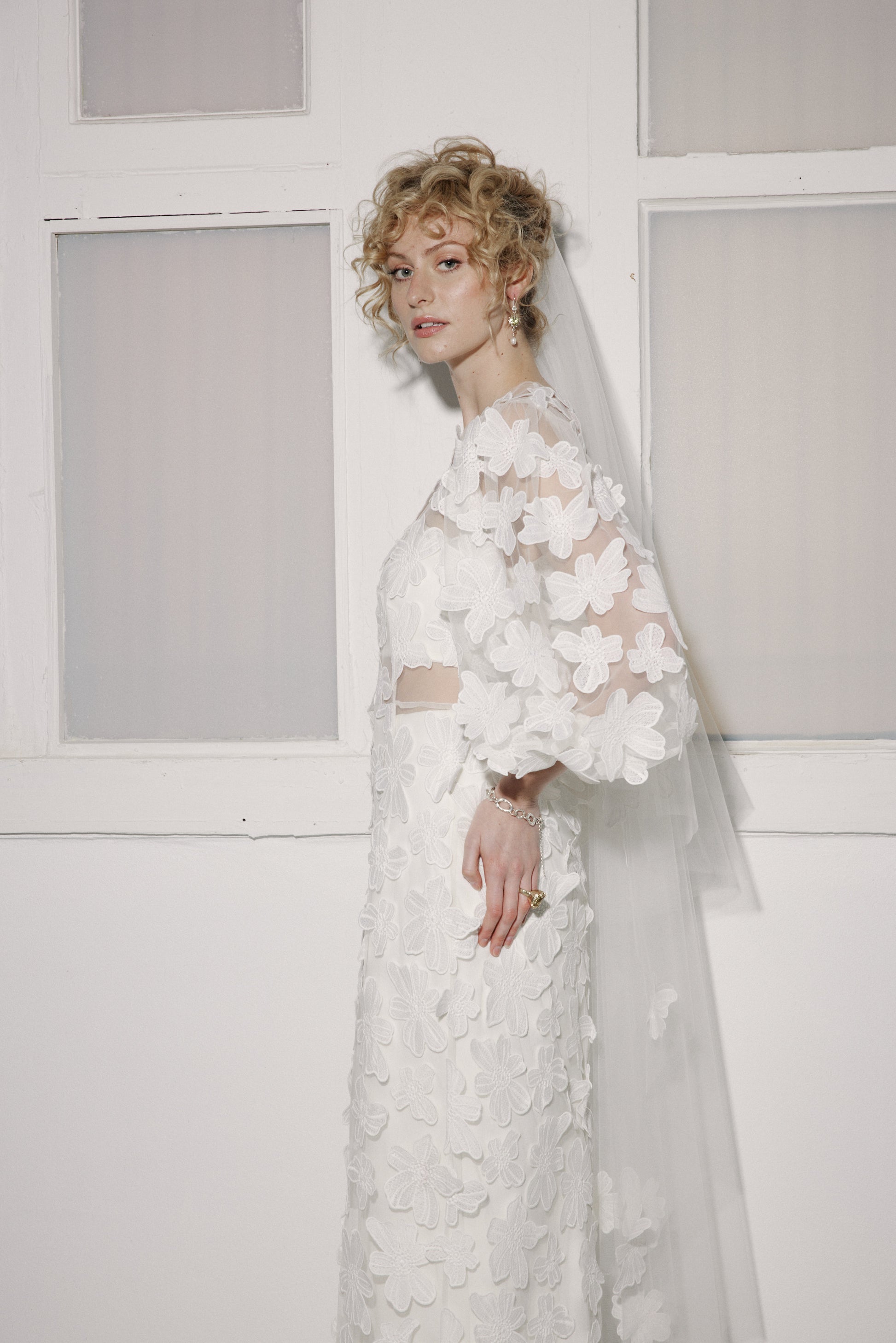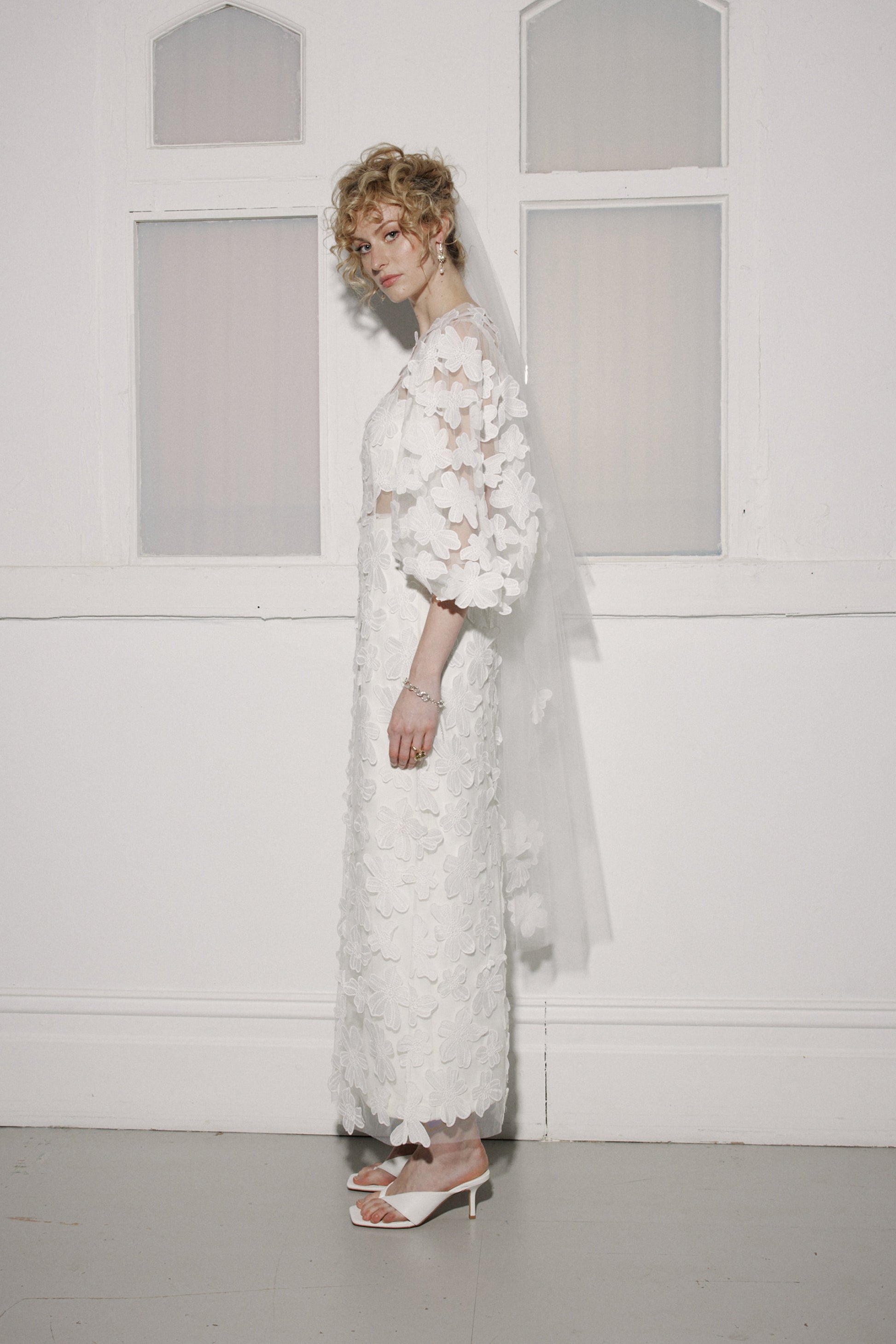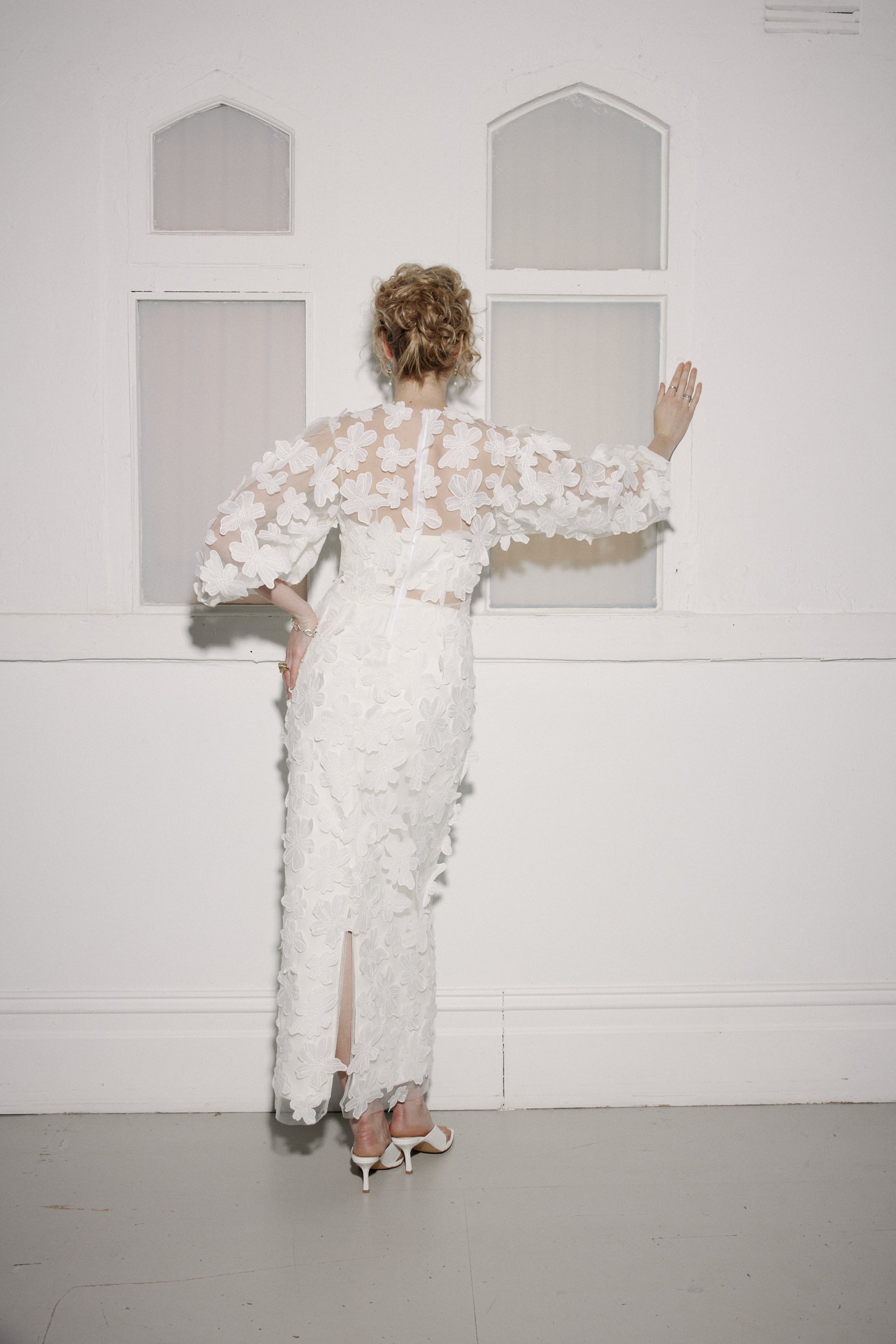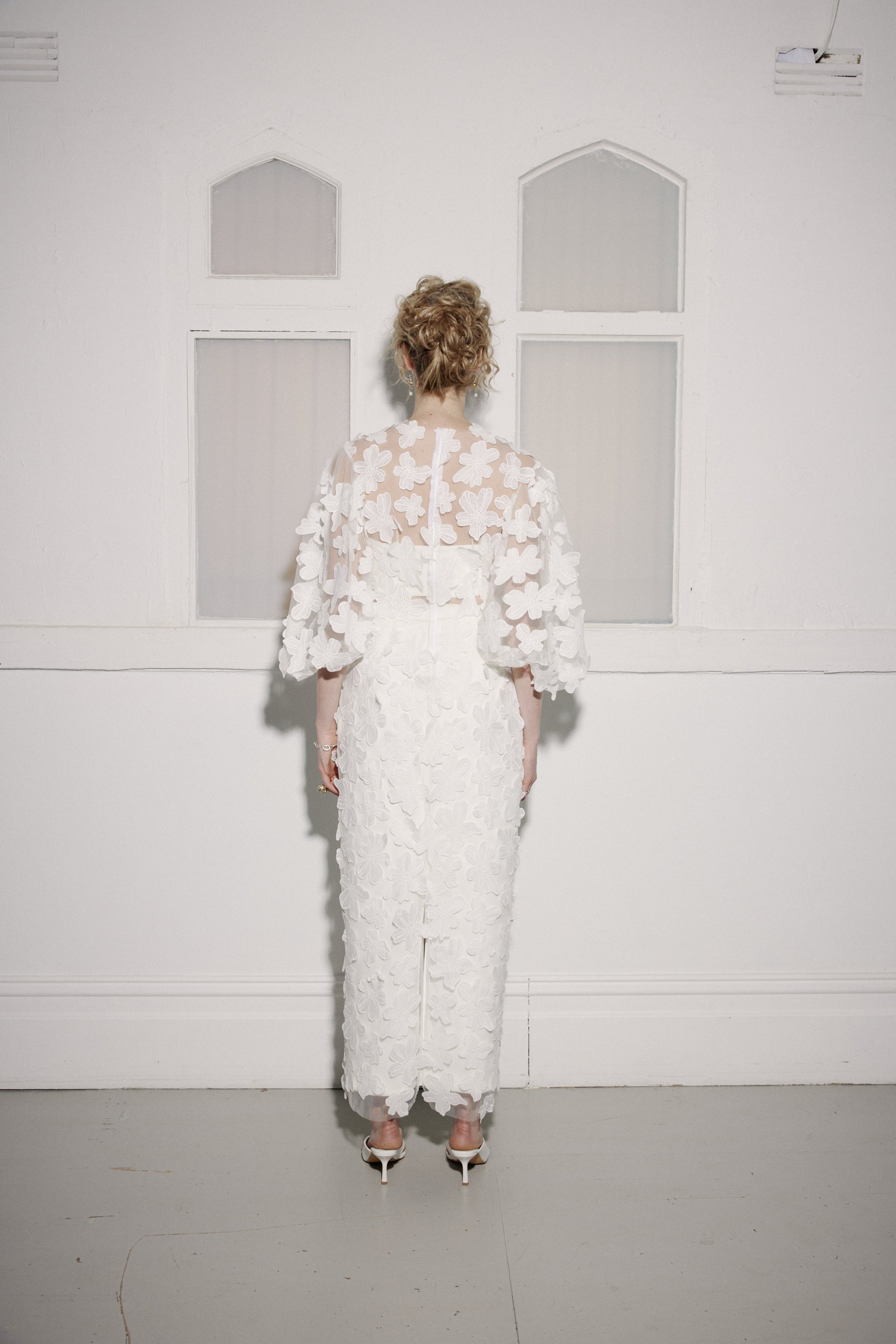 The tulle of this shell dress is embellished with floating Cosmos-style flowers, which are also hand sewn asymmetrically along the hem. It features a slightly dropped shoulder point, an exaggerated, gathered sleeve, scalloped hem, French seaming throughout and a centre back invisible zip