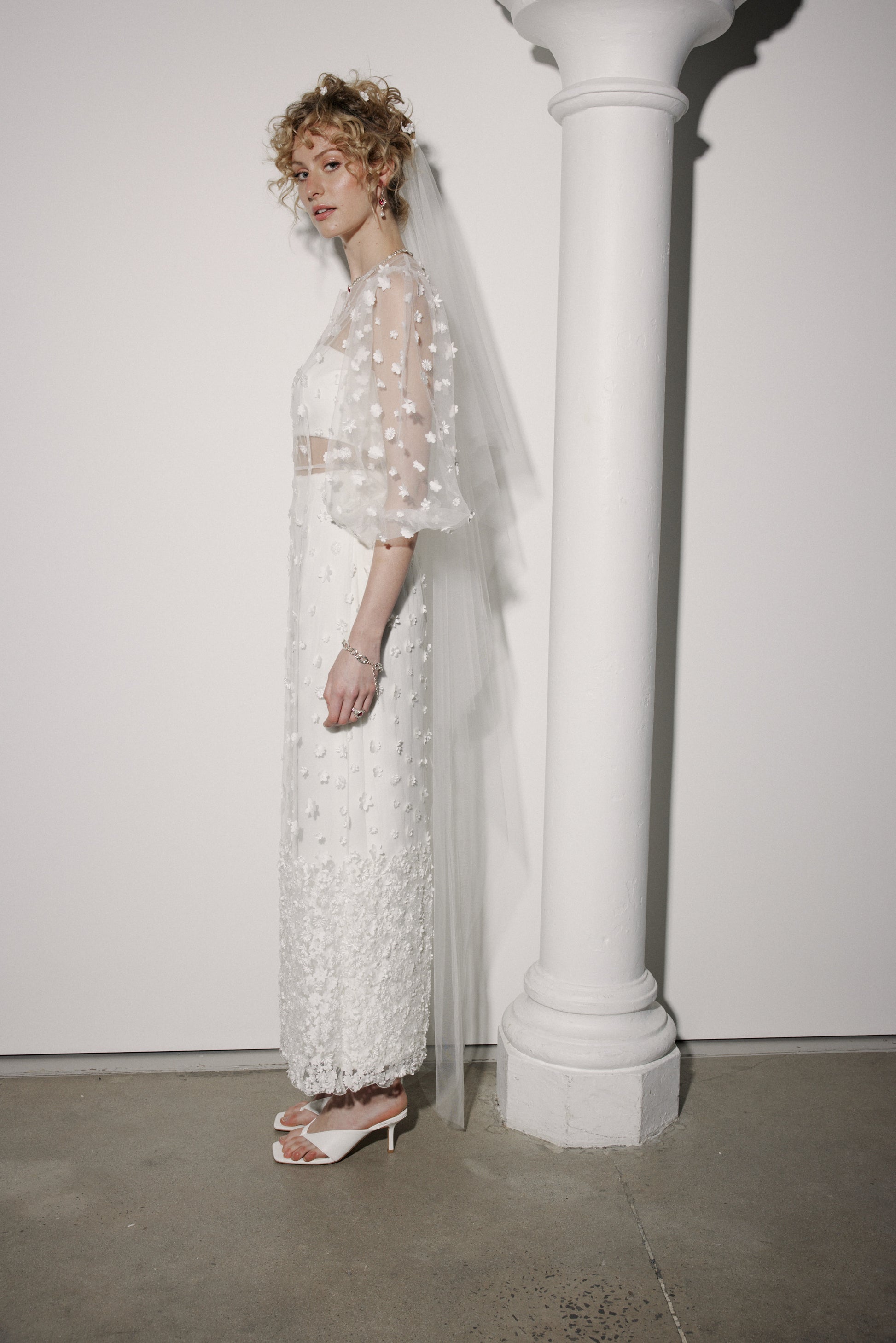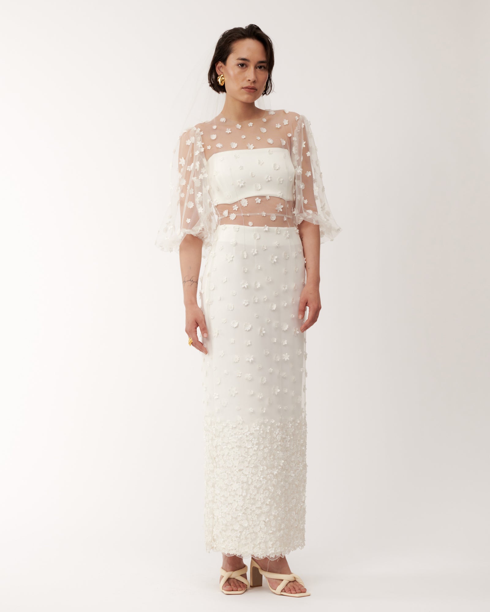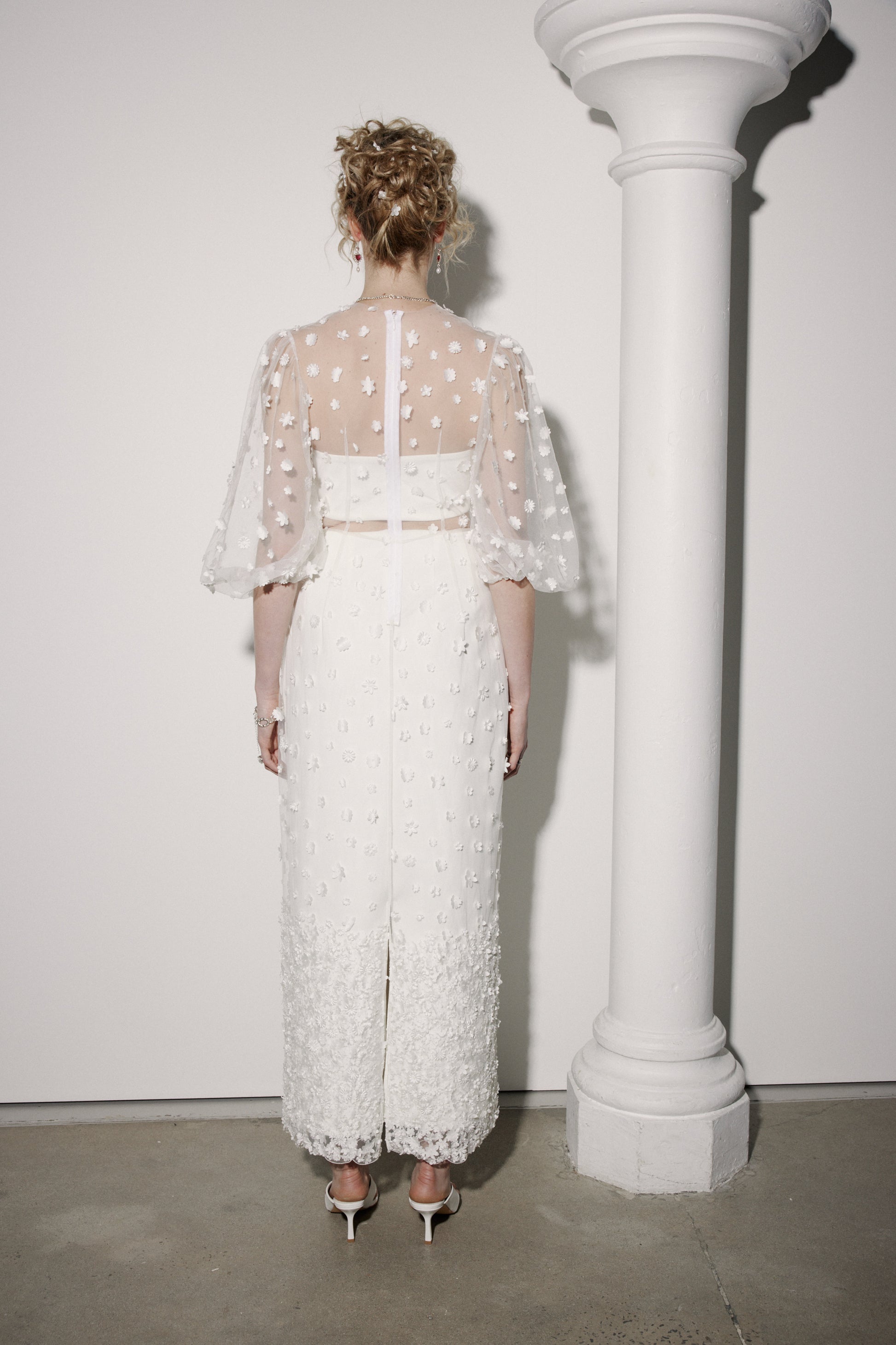 The tulle of this shell dress is embellished with scattered flowers that cluster more densely towards the hem of the garment. It features a slightly dropped shoulder point, exaggerated gathered sleeve, scalloped hem, french seaming throughout and a centre back invisible zip