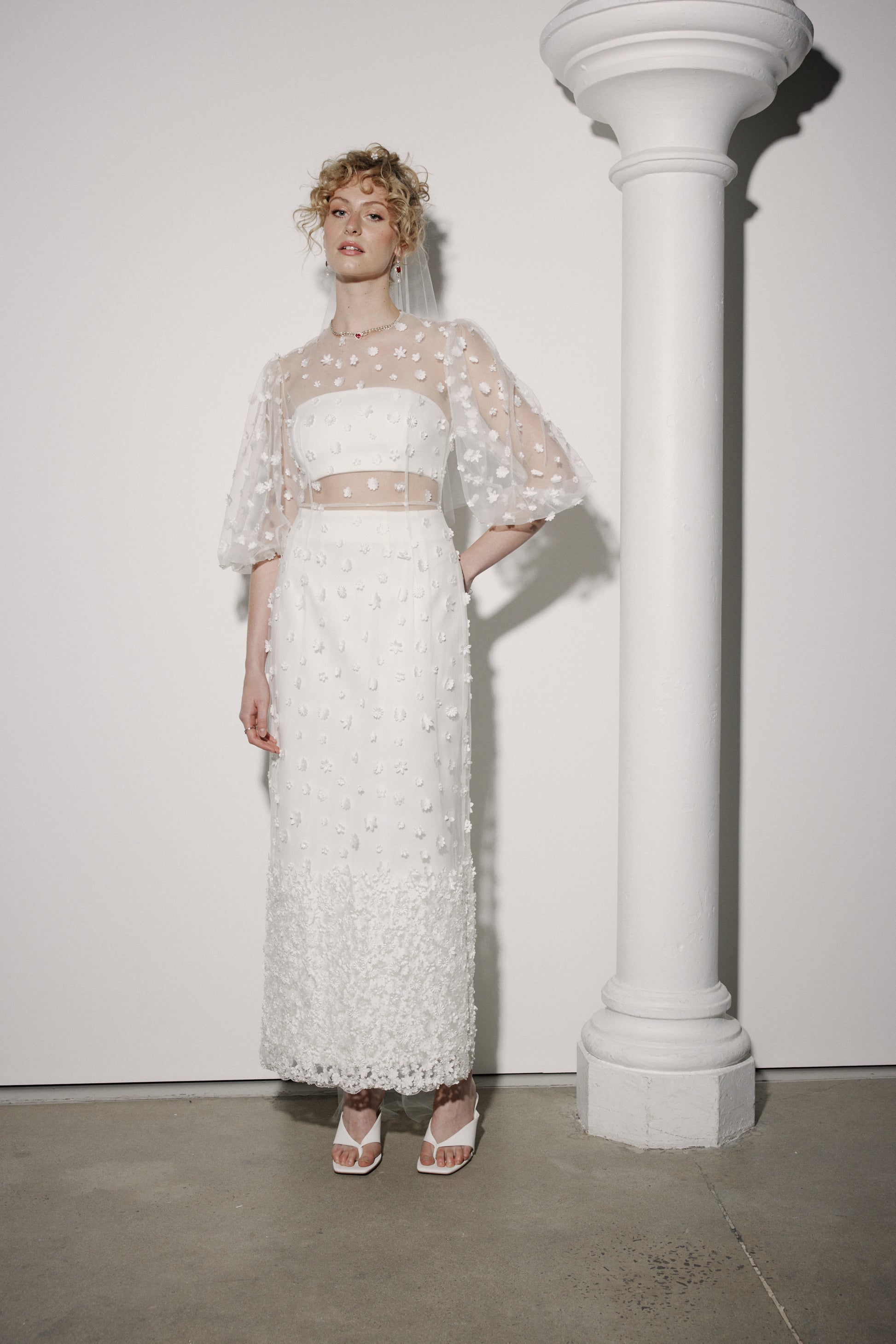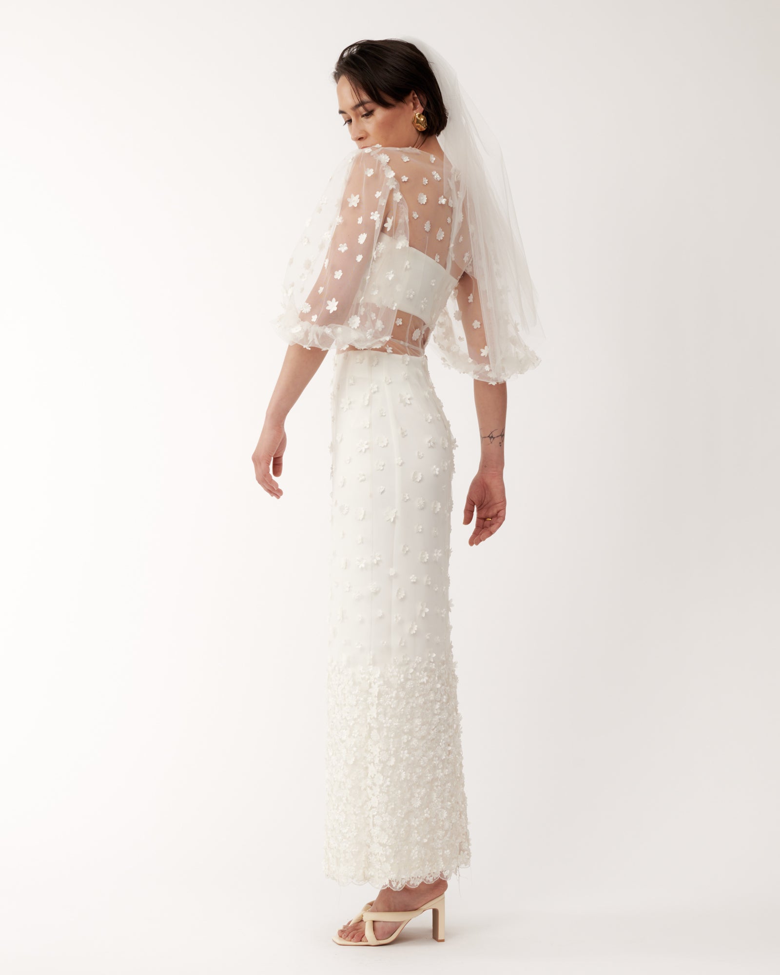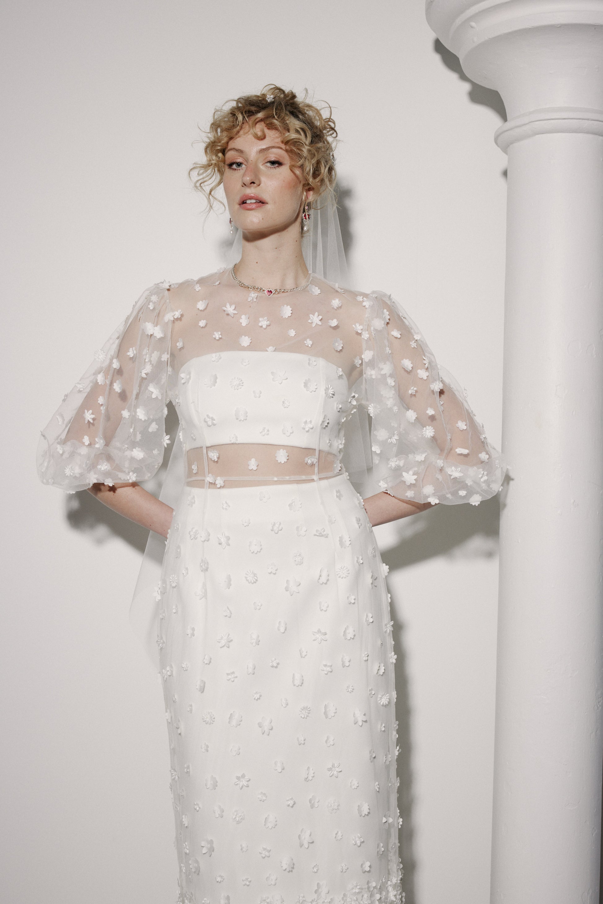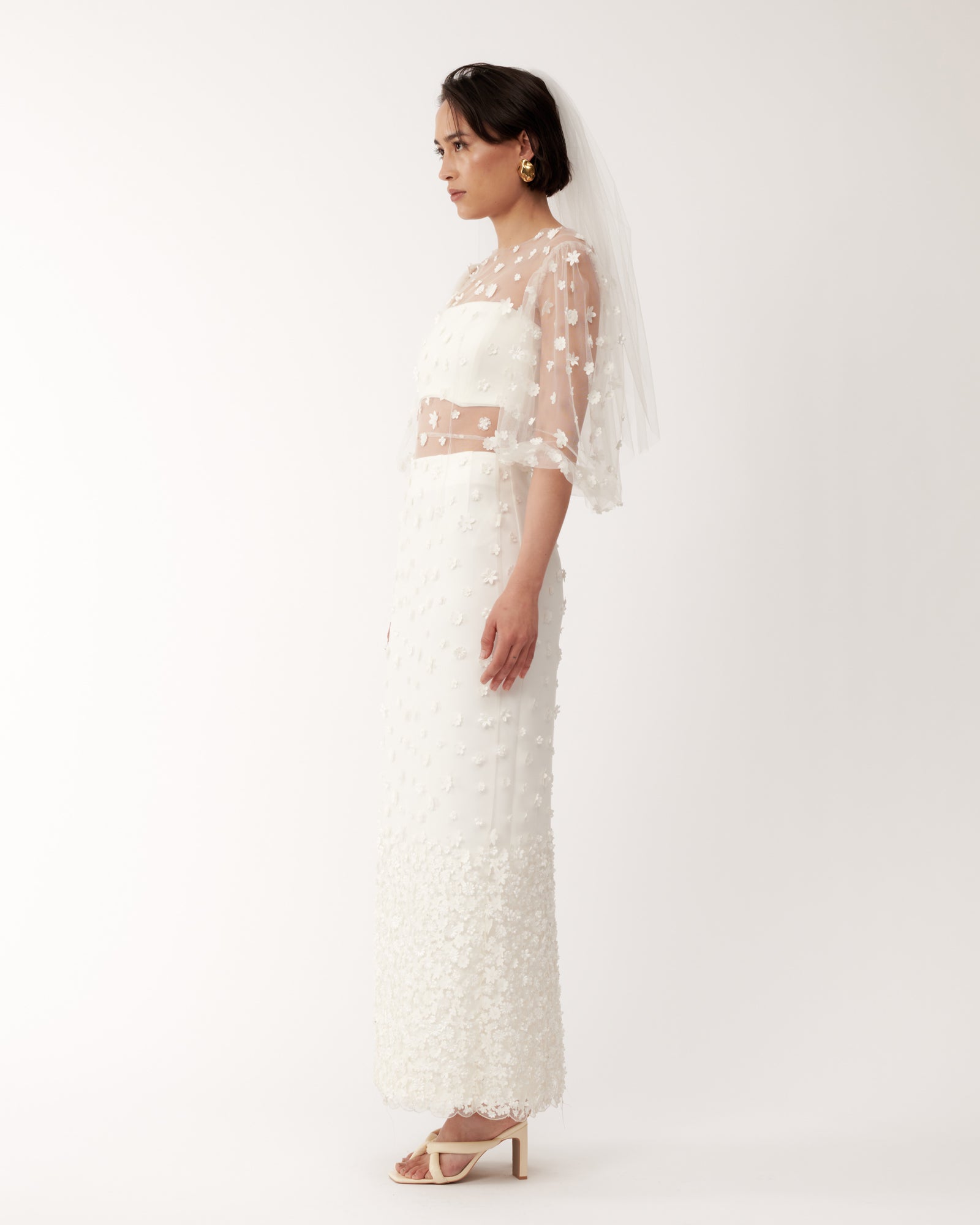 The tulle of this shell dress is embellished with scattered flowers that cluster more densely towards the hem of the garment. It features a slightly dropped shoulder point, exaggerated gathered sleeve, scalloped hem, french seaming throughout and a centre back invisible zip