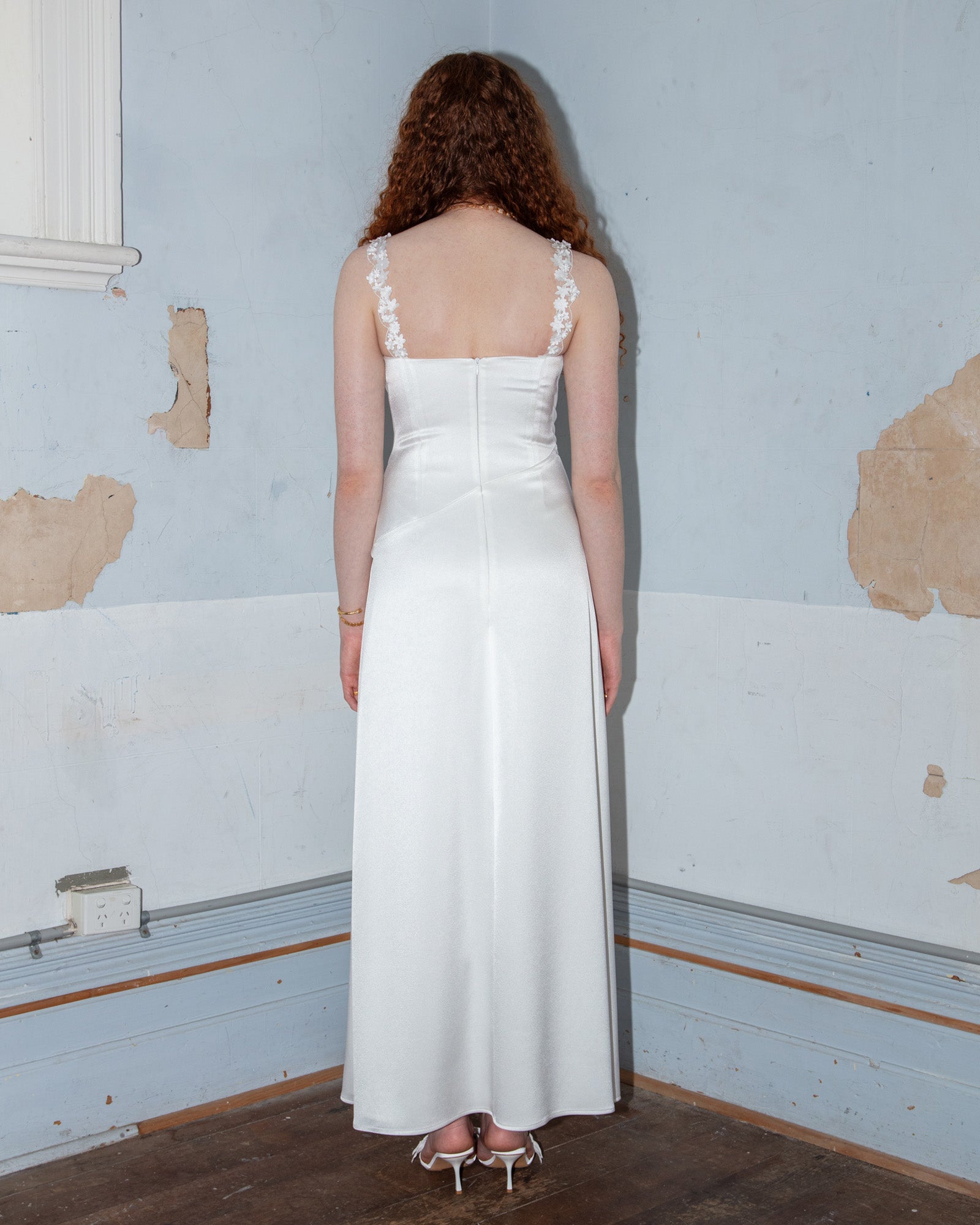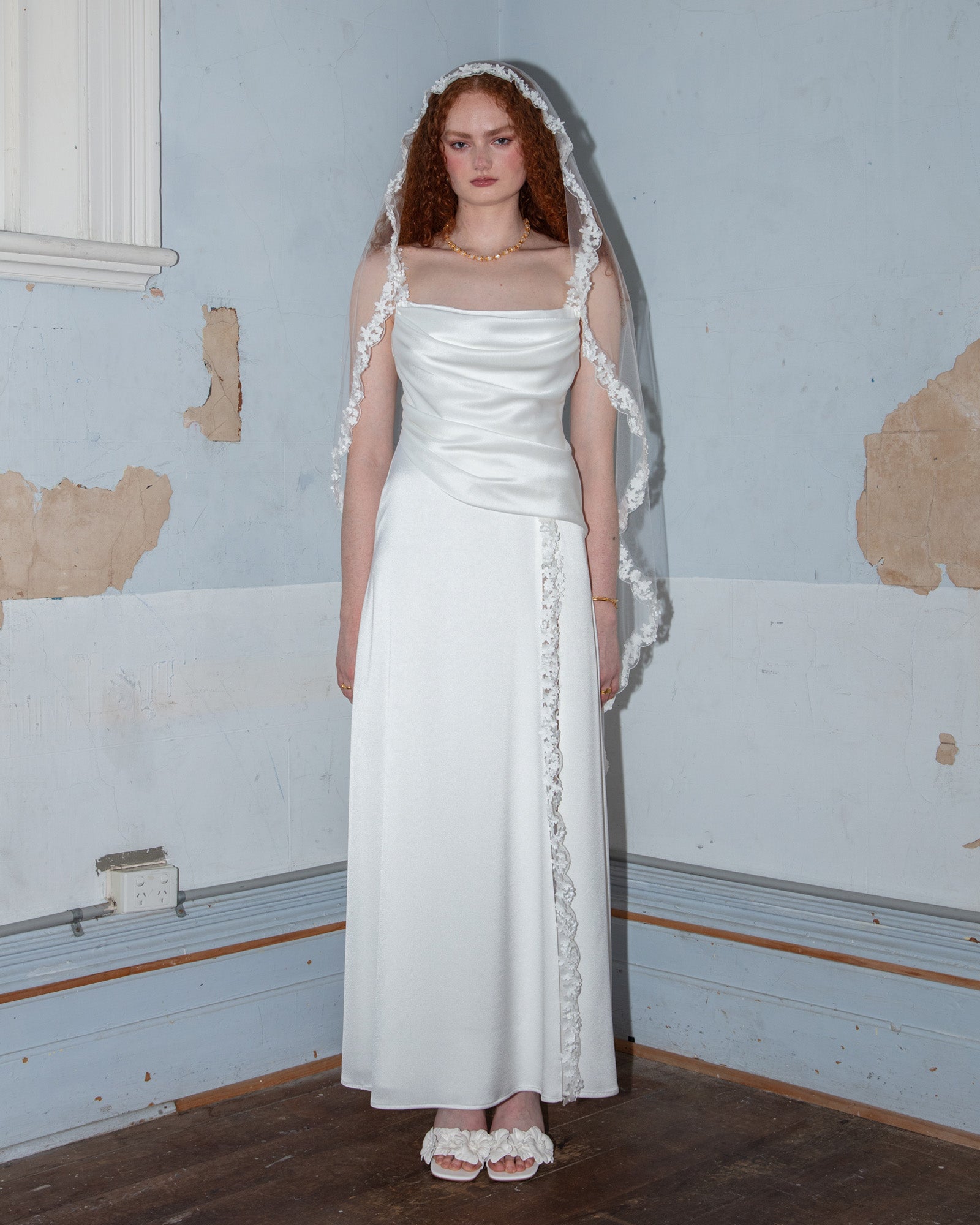 The Amanda Slip is all about those off-kilter details that make you do a double take. Asymmetrical tucking across the waist and high hip adds a sculpted edge, while the softly draped cowl neckline keeps it cool and effortless. Finished with daisy trim along the straps and hem for a touch of whimsy, and a center-back invisible zip to keep things smooth. Styled here with the Maree Veil—and if you’re feeling bold, throw on our Daisy Garter and hitch a ride on the back of a Harley.