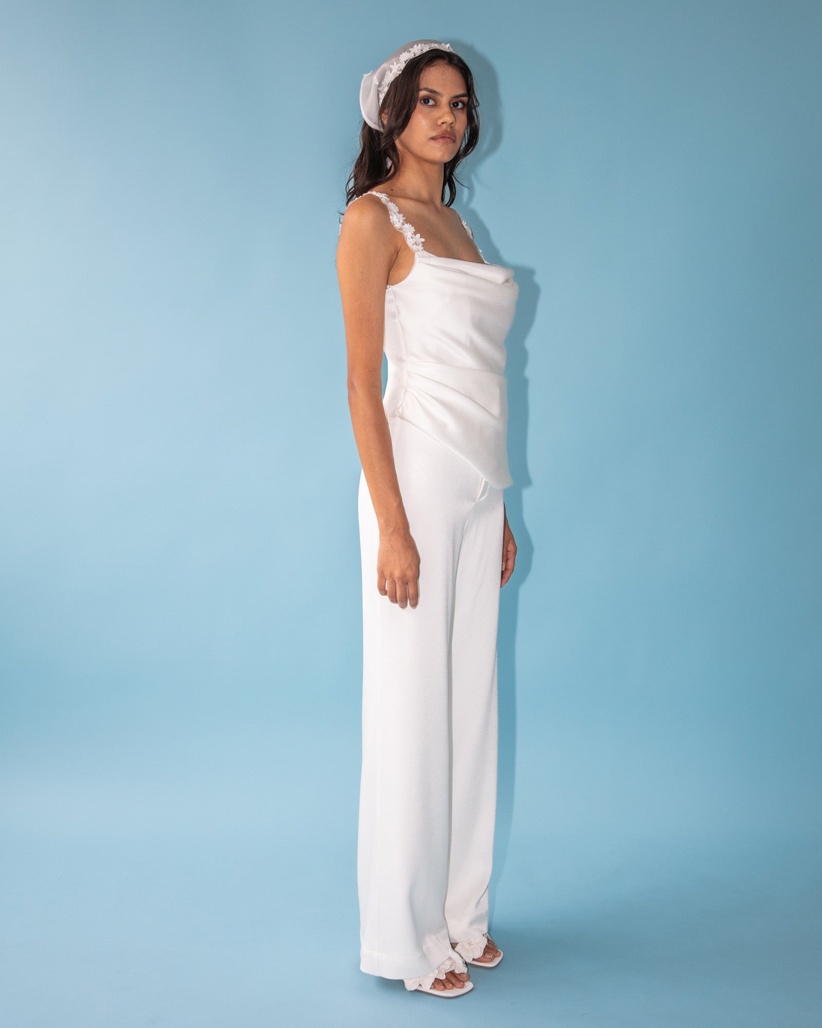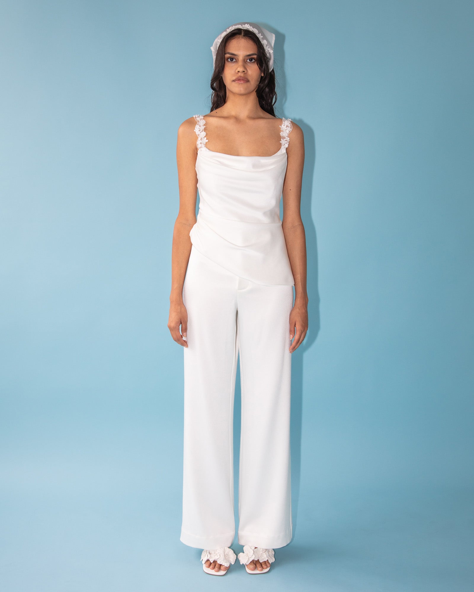 The Amanda Slip Top is the same vibe as the slip dress, but, you know, in top form. Featuring the same asymmetrical tucking across the waist and high hip for that laid-back sculpted look, plus a draped cowl neckline. Finished off with daisy trim on the straps and hem for that touch of texture. It’s the slip dress you love, but for your top half.
