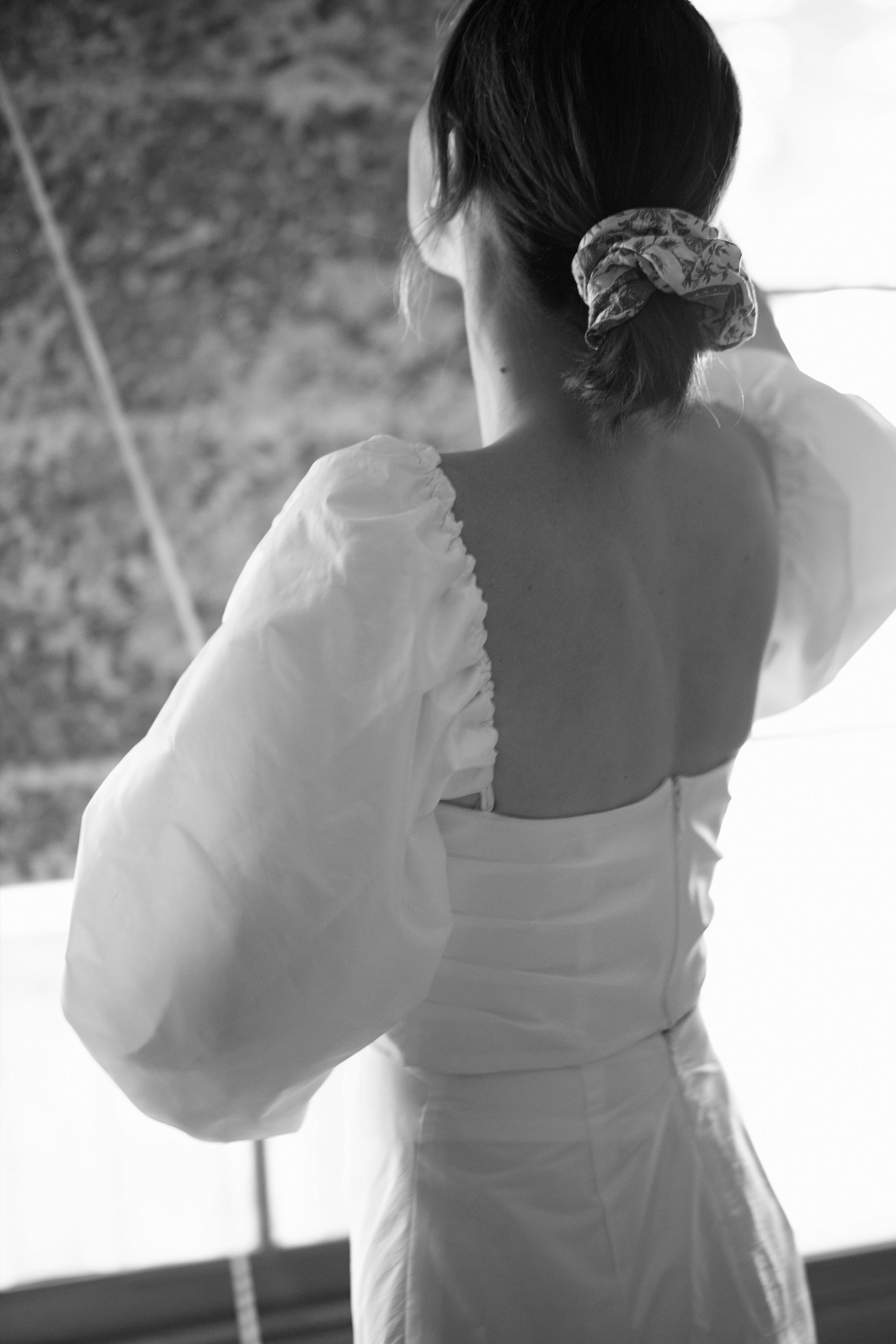 The off-shoulder balloon sleeve is attached at the underarm point with hidden rouleaux loops and buttons.