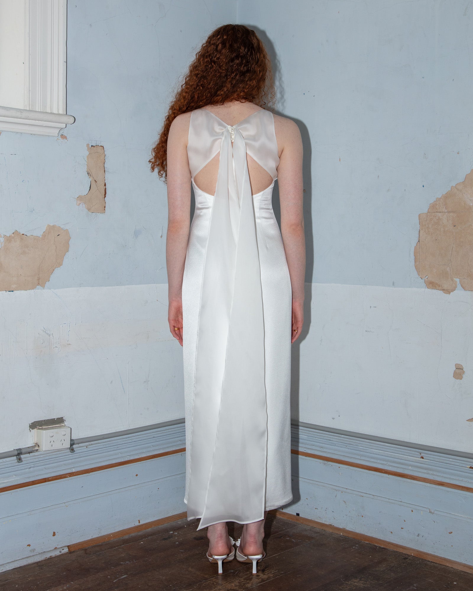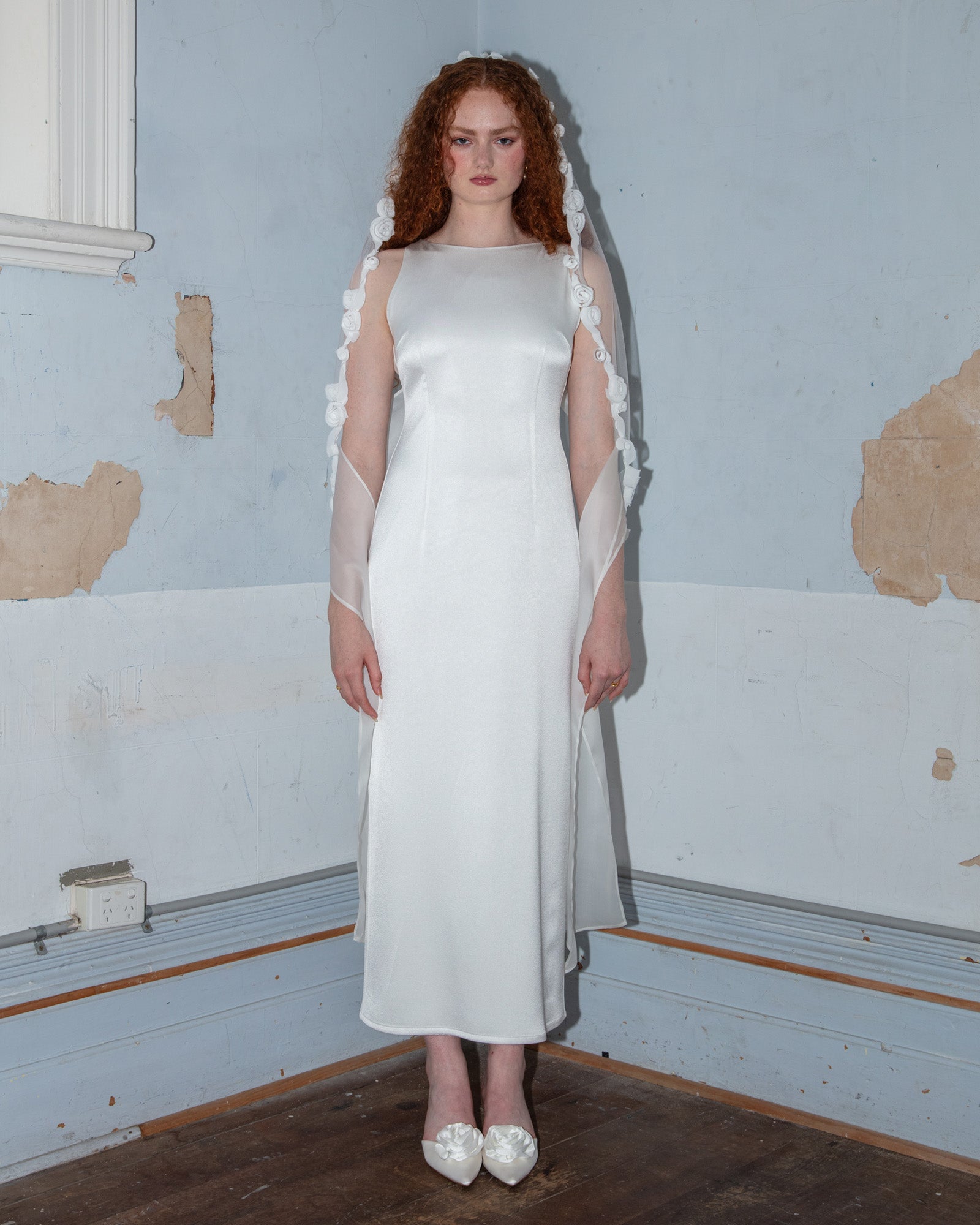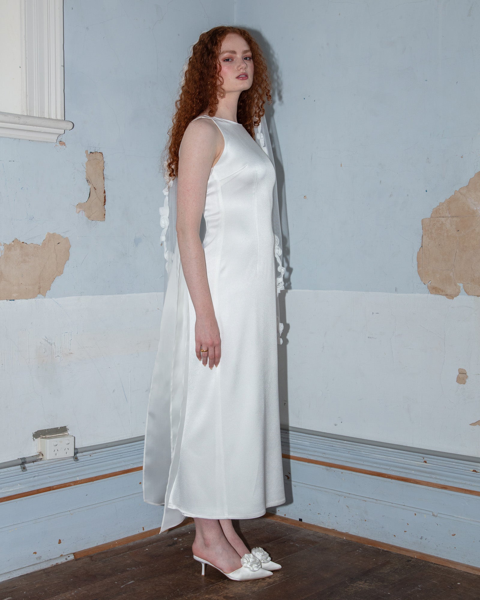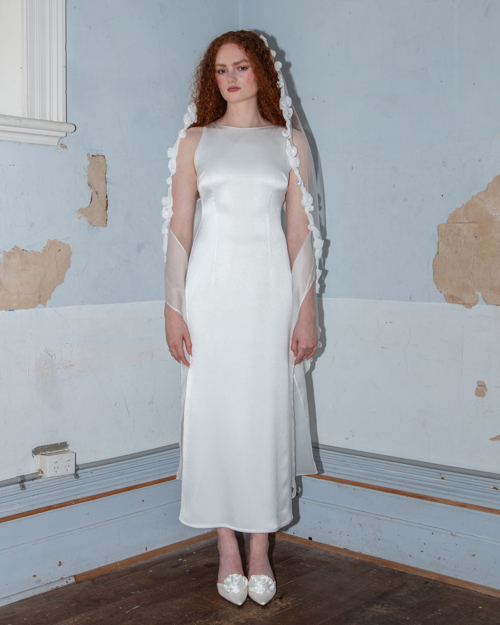 The Julia dress just got a sister. Same crisp boat neck and A-line vibe, but now with a lowered back that feels just the right amount of hot. Fully lined for structure and skipping the sheer overlay—because sometimes less is more. Paired with the Maree Rosette Veil, it’s understated but never underwhelming. Perfect for a quickie at the registry office and where the night takes you.