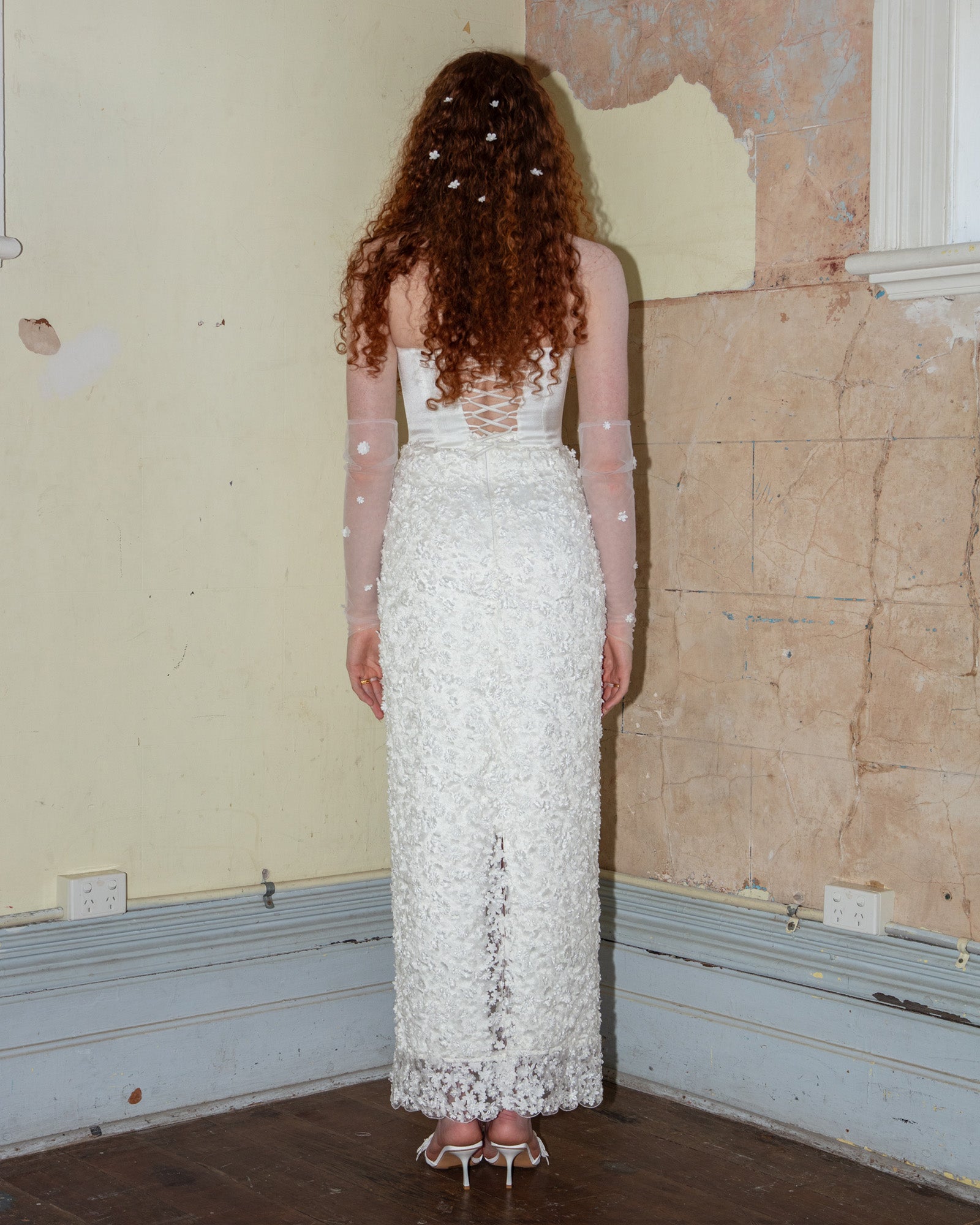 The sister of our beloved Column Skirt, the Caitlin is a total scene-stealer. Crafted from iconic daisy lace with delicate scalloped edges, it’s the perfect mix of structure and romance. Featuring a sleek column silhouette and a centre-back invisible closure for a flawless finish. This form fitting, straight skirt is crafted out of a neoprene knit for a comfortable fit with a fitted waist and hip and a back split for ease of movement.