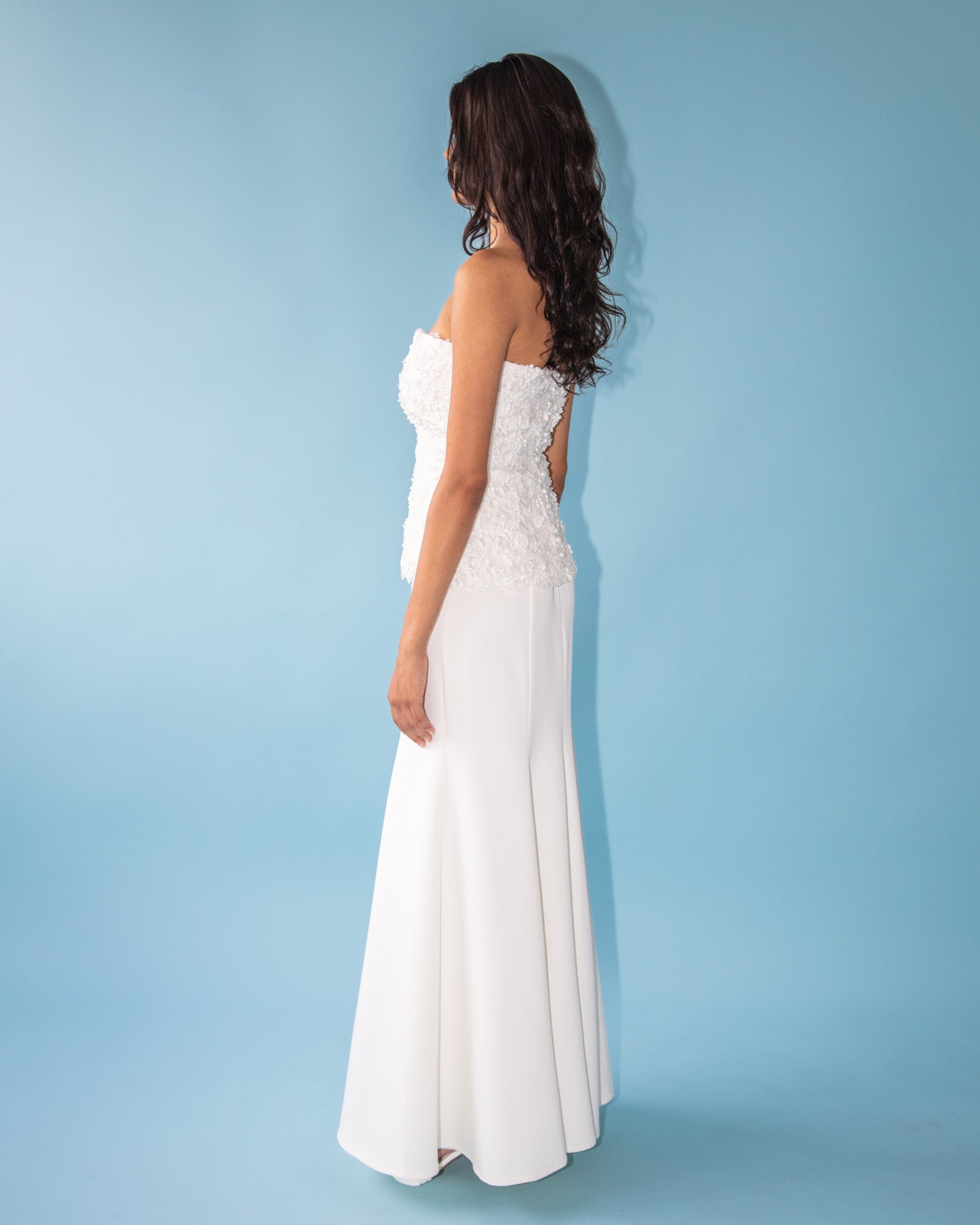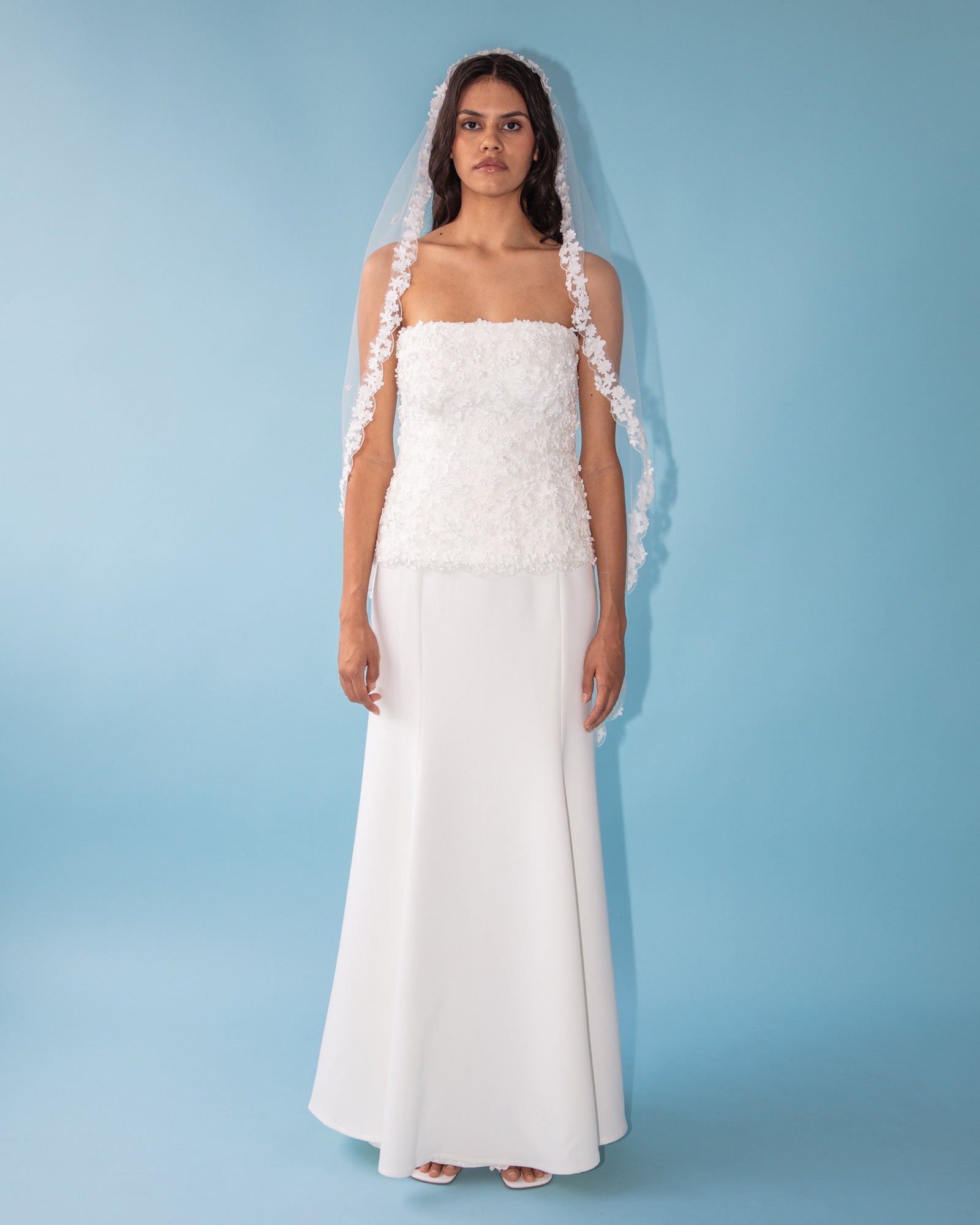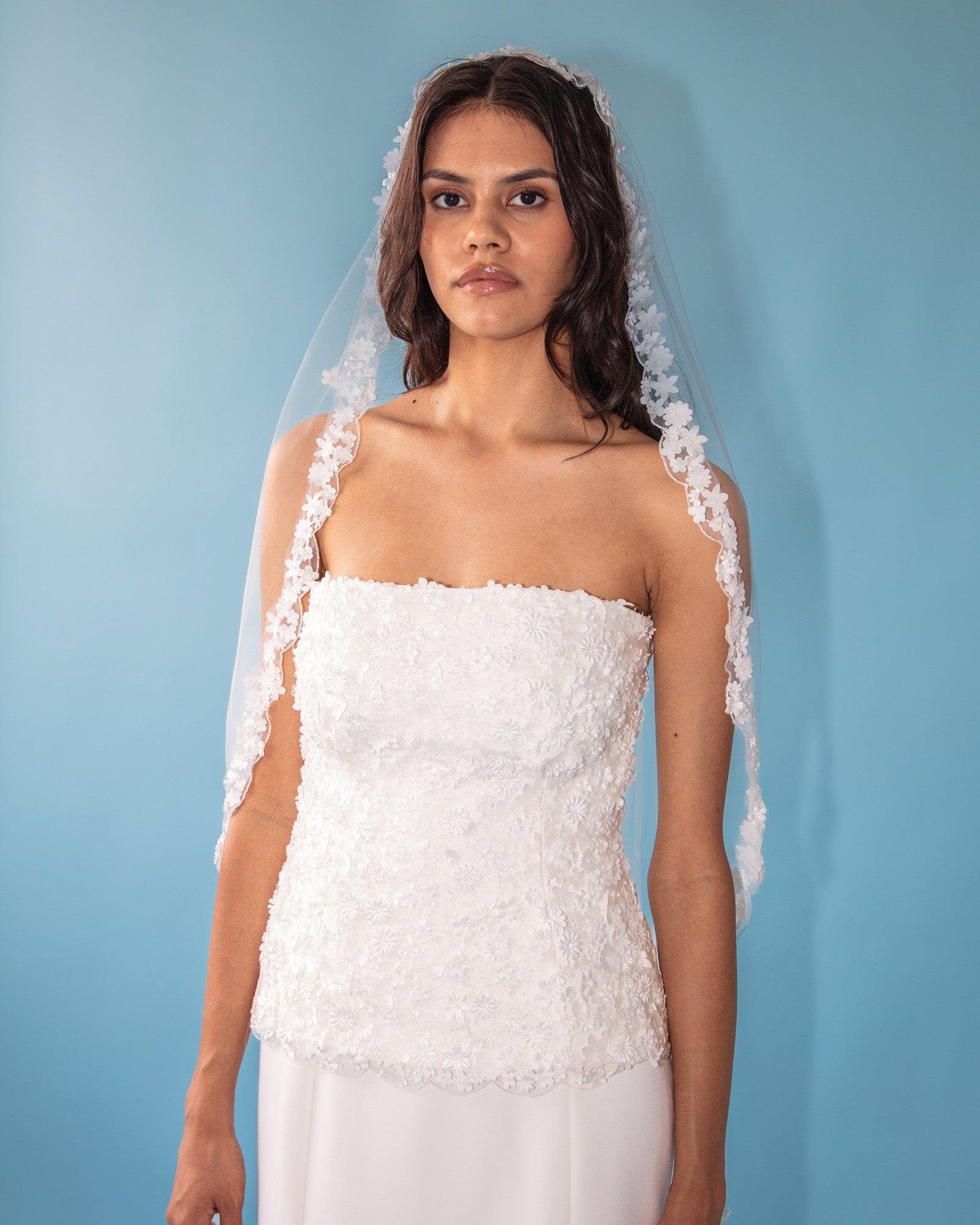 The Carly Top in Daisy is serving 90s Jen Aniston with a side of Lorelai Gilmore. Pearl shank buttons and rouleaux loops trail down the center back, while fitted under-bust tucks and a dropped waist fit keep things tailored but effortlessly chic. This version is decked out in our signature daisies for that perfect pop of texture. Pair her with, well, pretty much anything — we’ve styled her here with the Column Mini Skirt in Scuba and Taylor Bow Veil as well as with the Cherilyn Godet skirt.