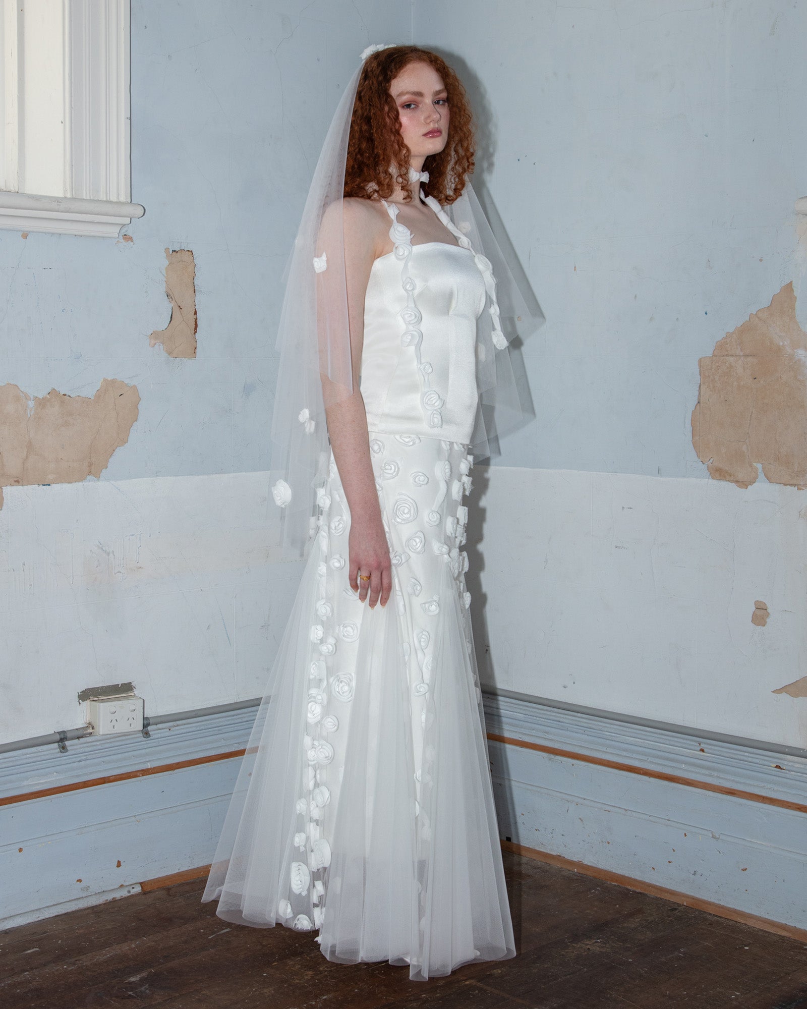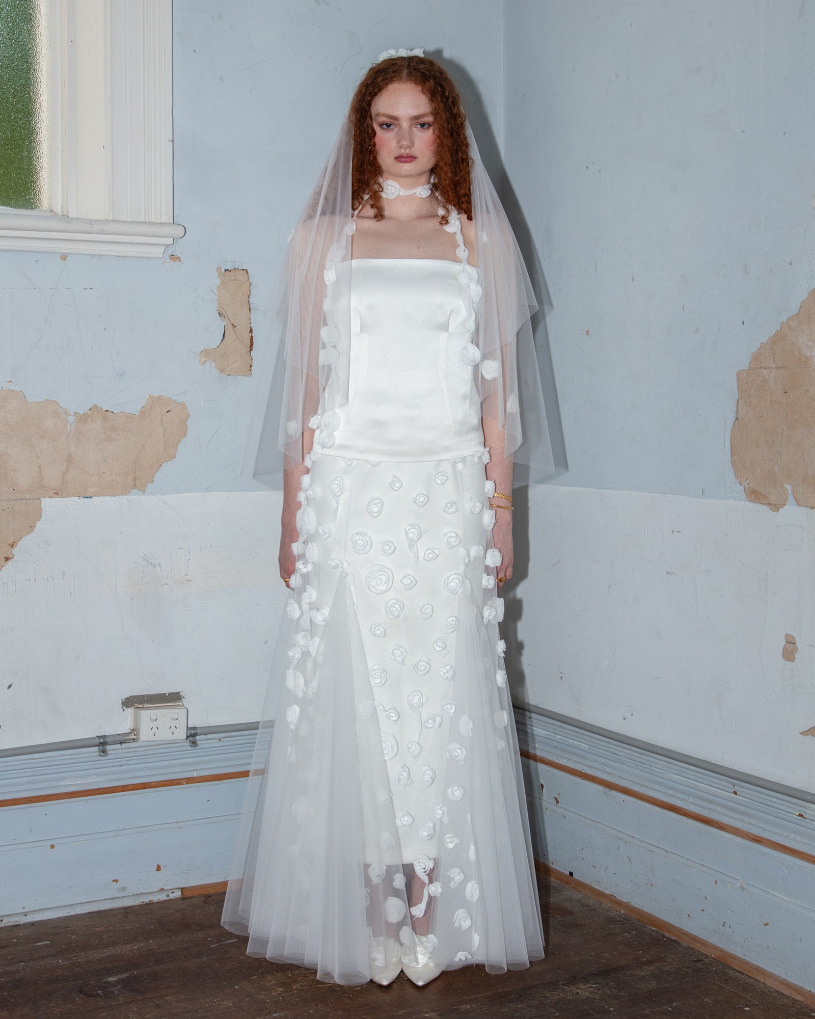 Jett wears this look with the Caitlin Skirt, Lorrae skirt, Rose Choker and Rose Veil.