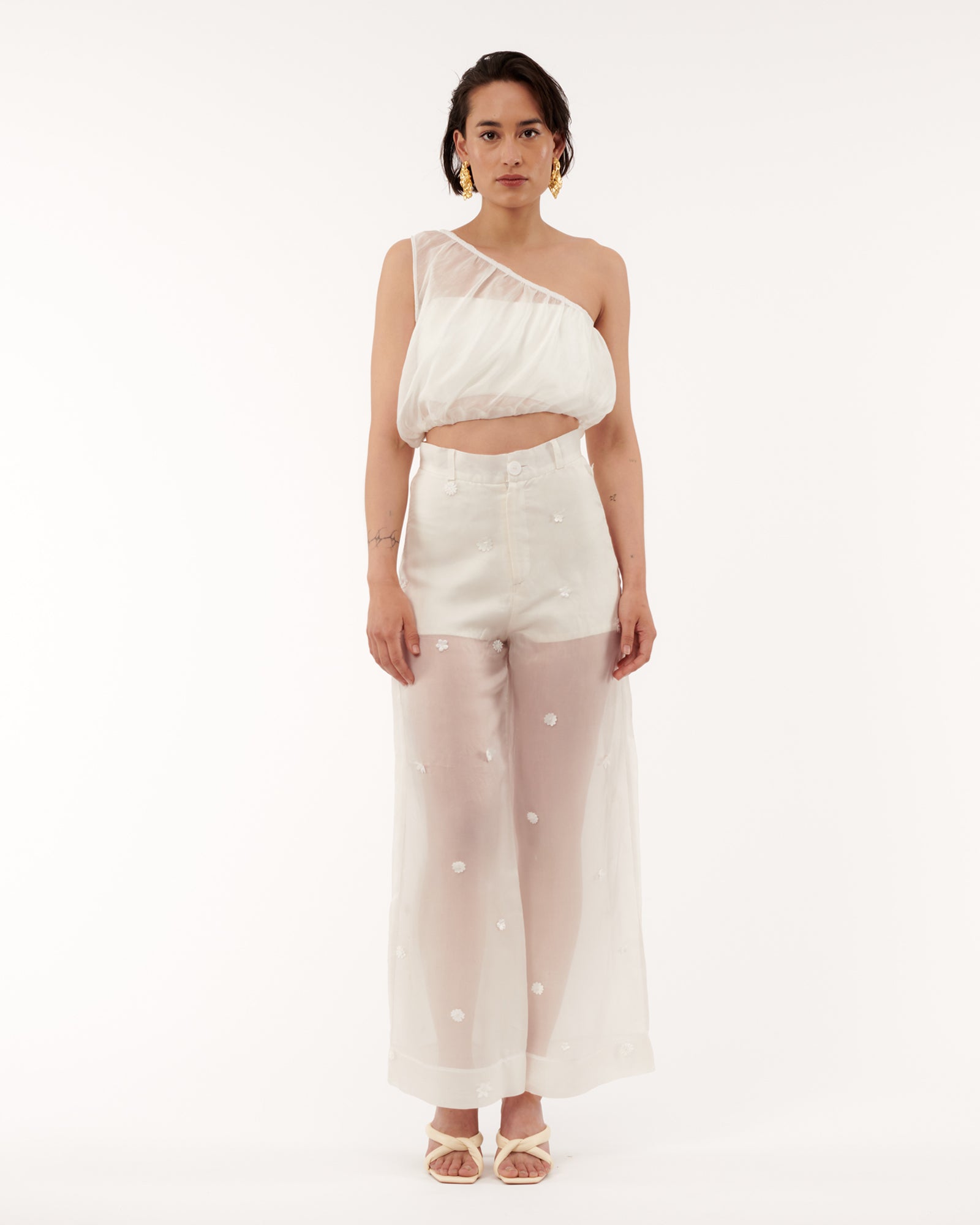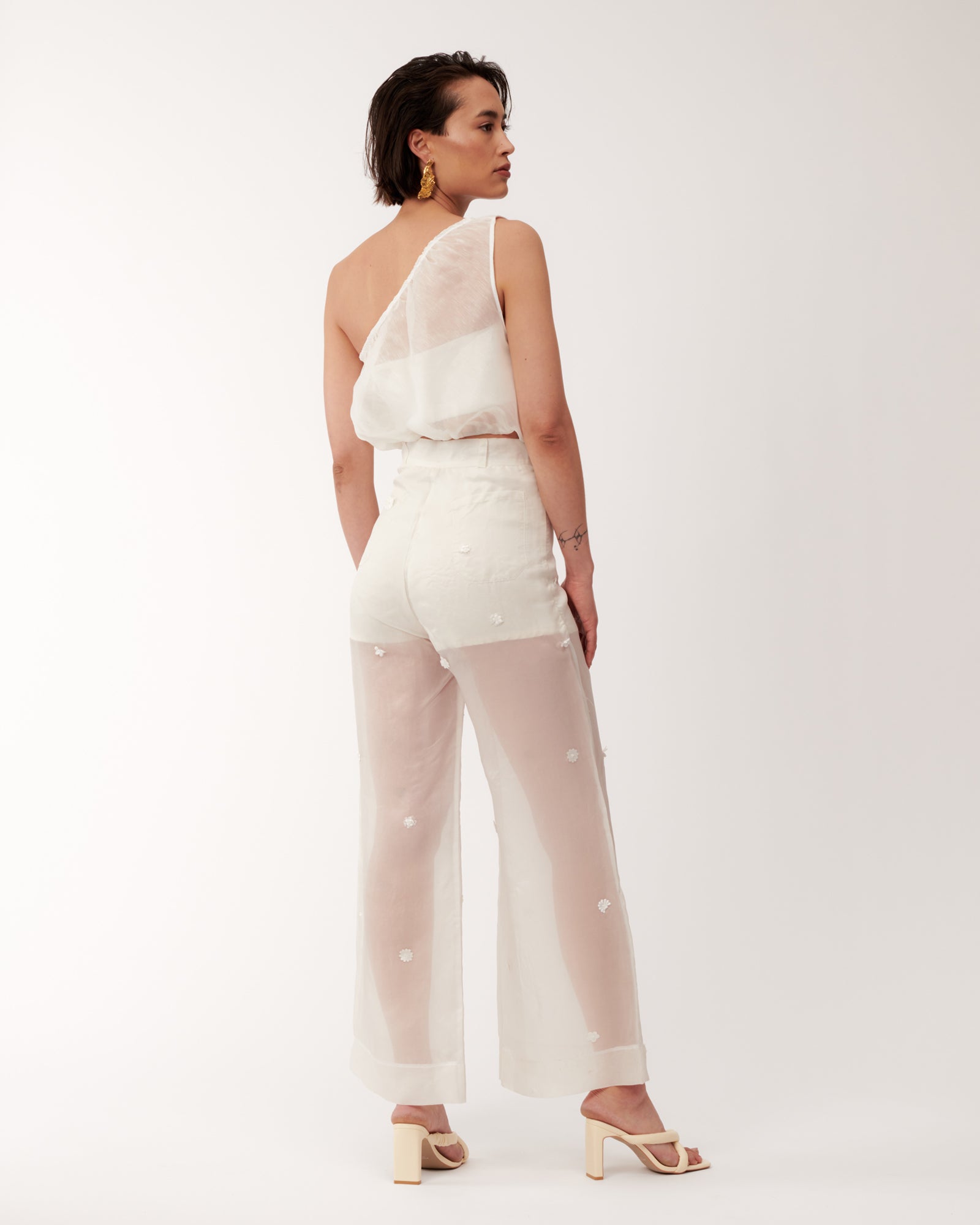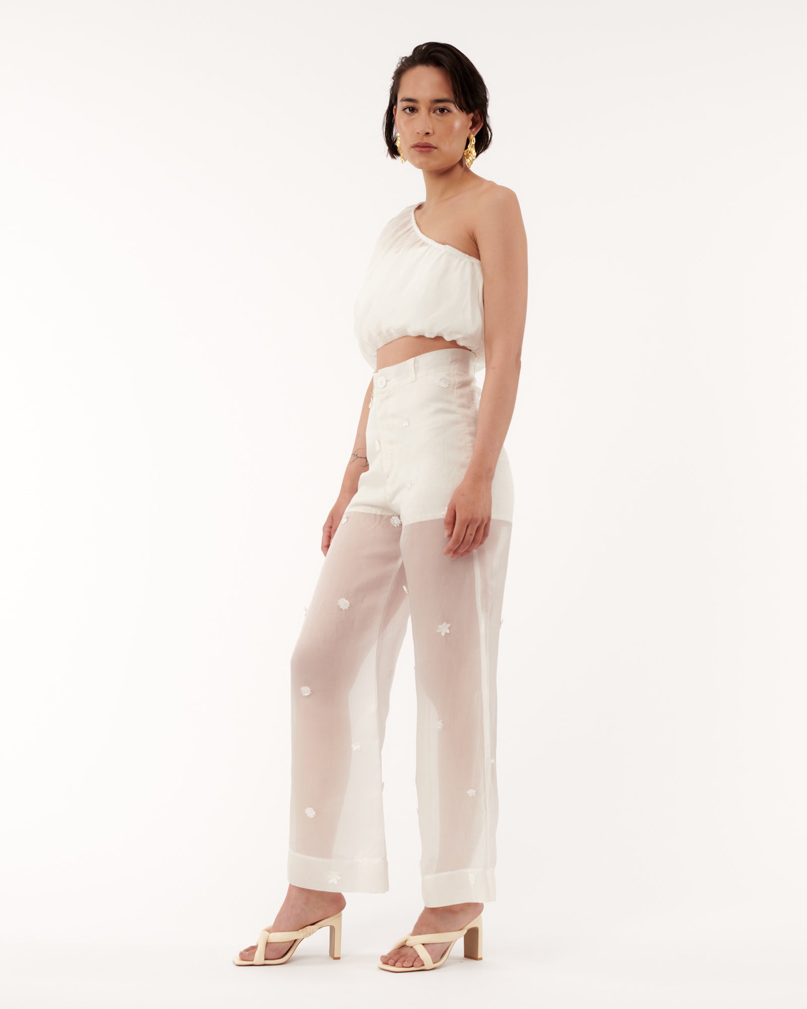 The Chloe Pant a playful alternative to a classic suit pant, infused with 1970s disco energy. Crafted from a sheer silk satin organza embellished with handsewn flowers, this fabulous iteration of the Chloe Pant is completed by a hot pant style short sewn into the garment. They feature a flattering high waist, back patch pocketing, a flared leg and covered fly front.