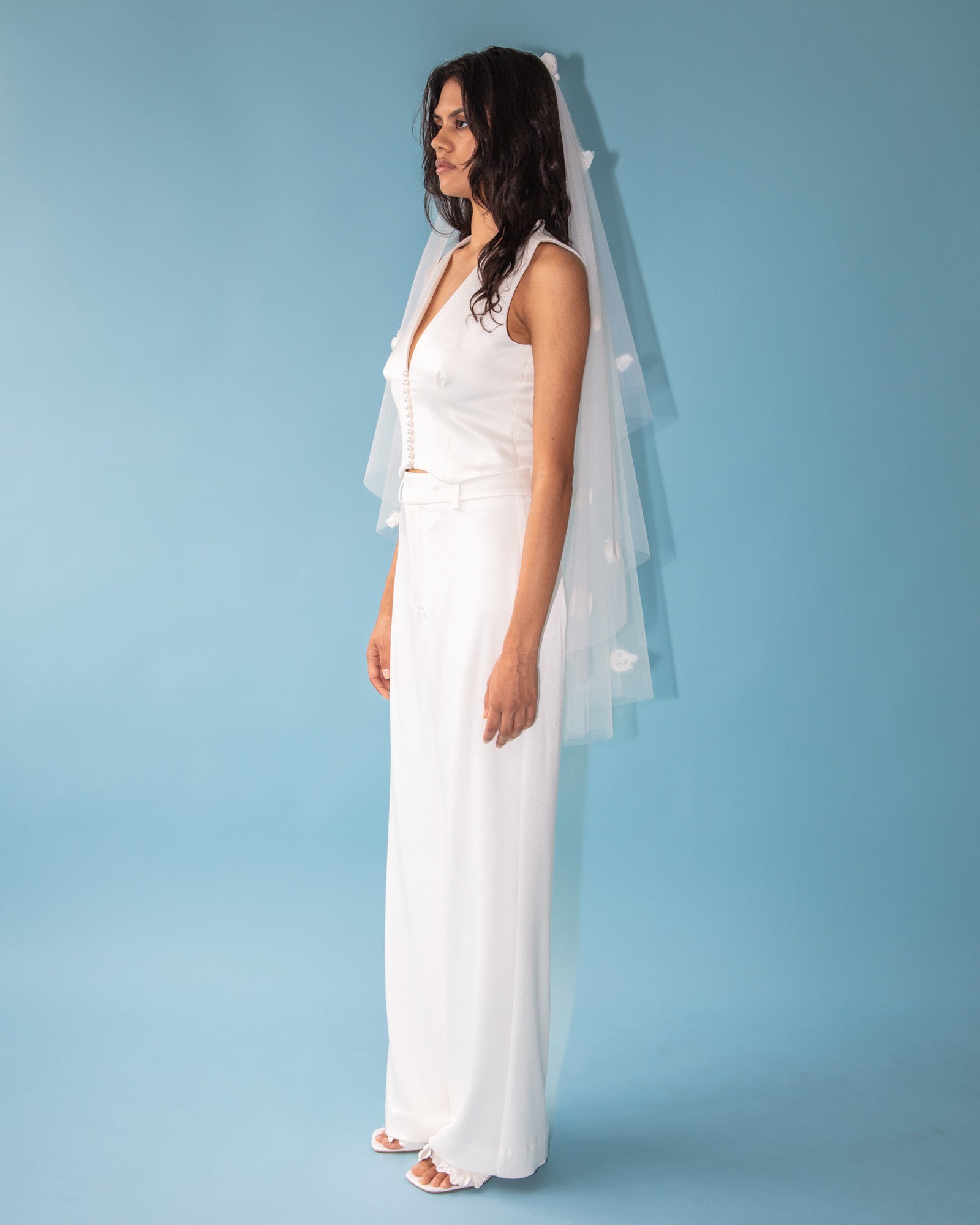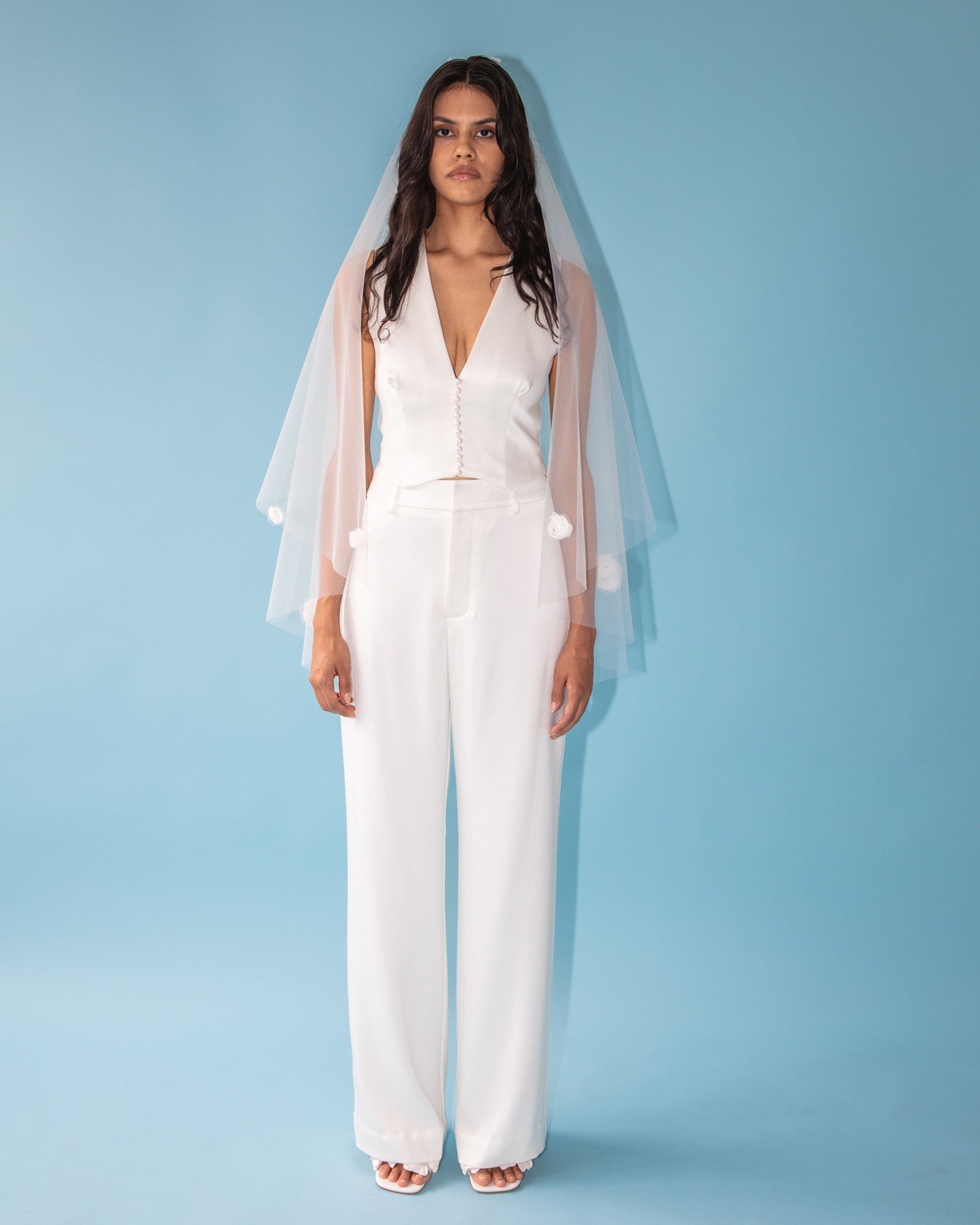 The Diane Vest is giving you a little yeehaw with a side of sophistication. Pair her with the Goldie Pants for that perfect mix, and top it all off with the Rose Layered Veil for an unexpected twist. It’s the kind of look that says, “I could ride a horse and look immaculate at the same time'.