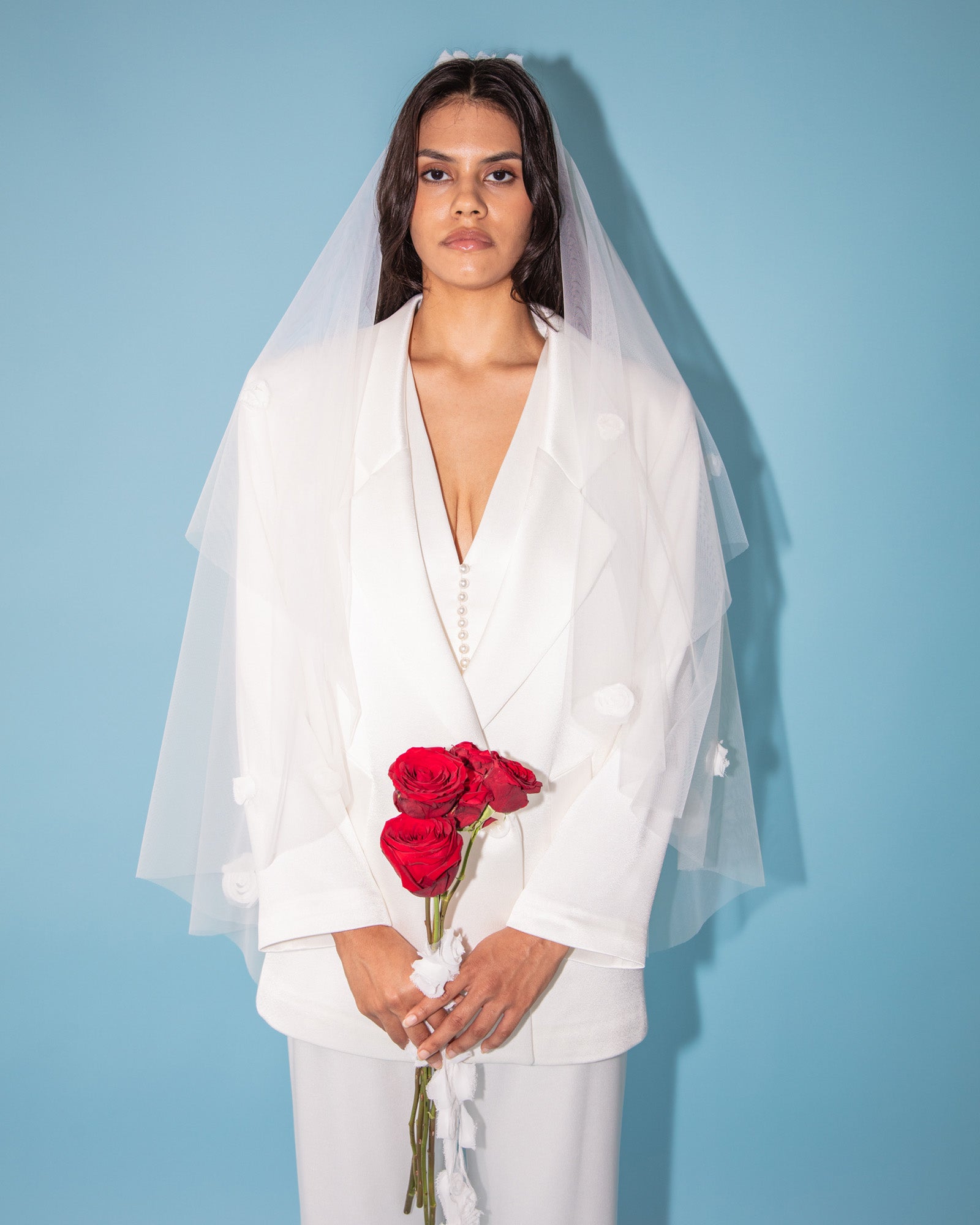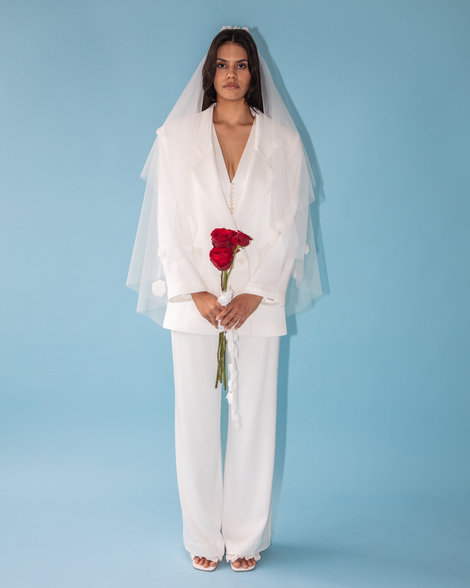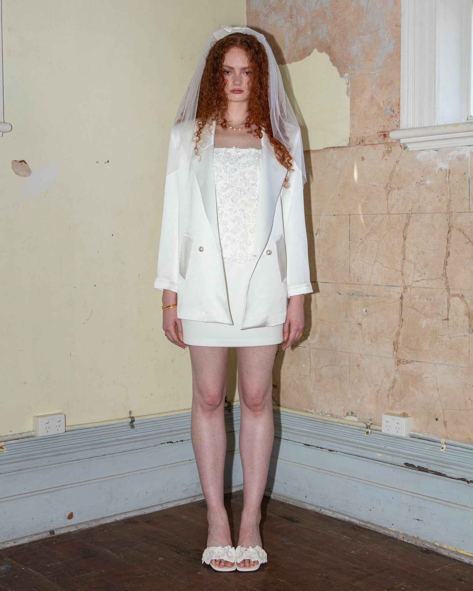 Pair it with the Goldie Pants for a full suit moment, or wear it with the Carly Top and Caitlin Mini Skirt to keep it cool and effortless. Styled here with the Taylor Bow Veil.