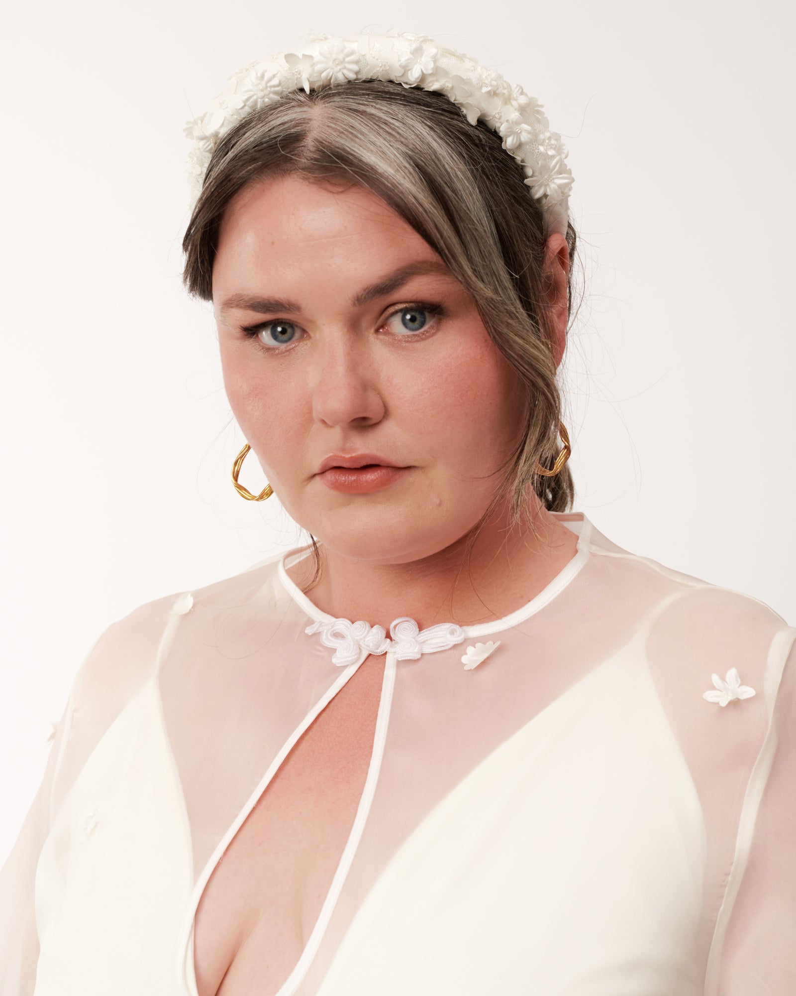 An ivory headband embellished with flowers, this is a cute alternative to a more traditional head piece.
