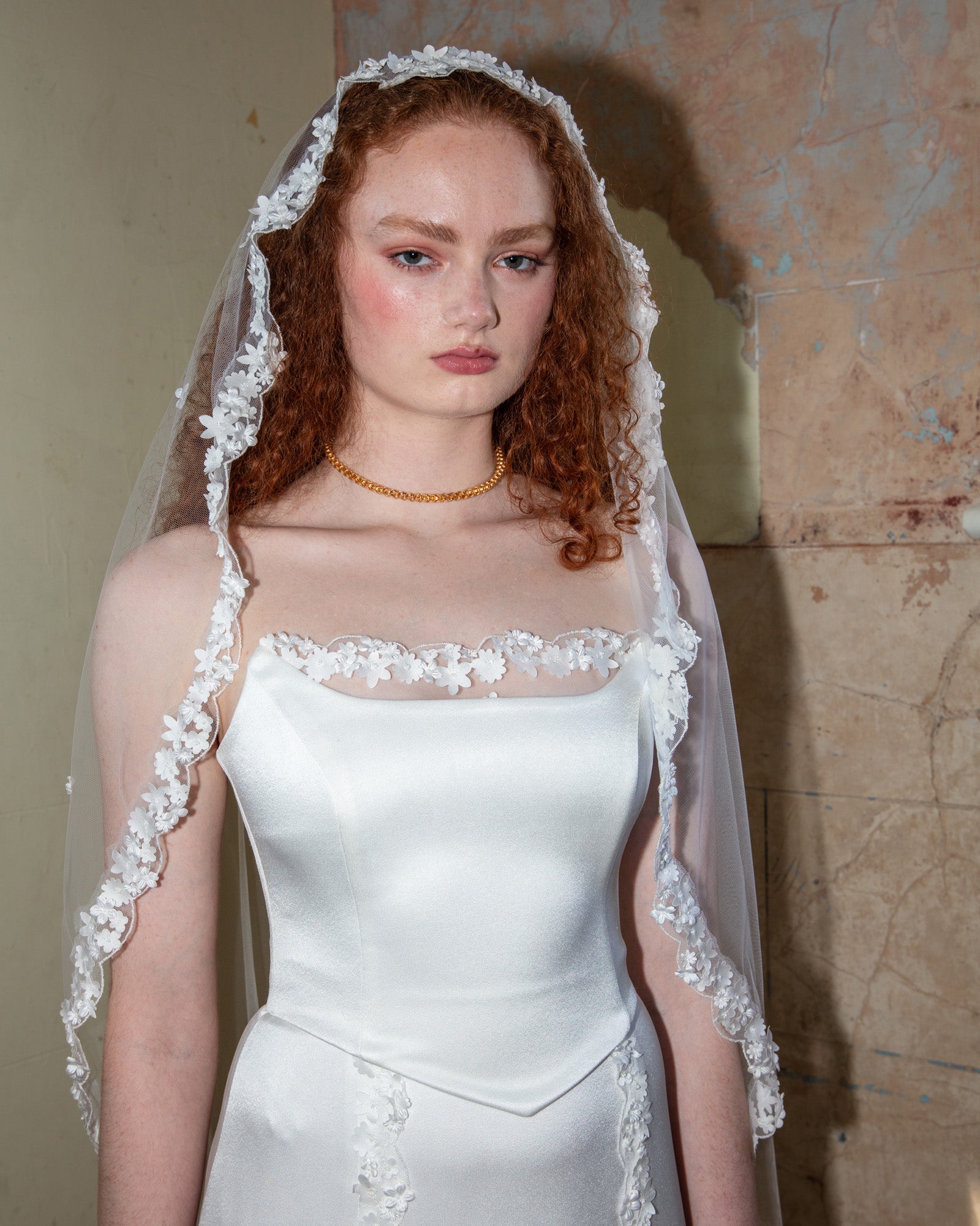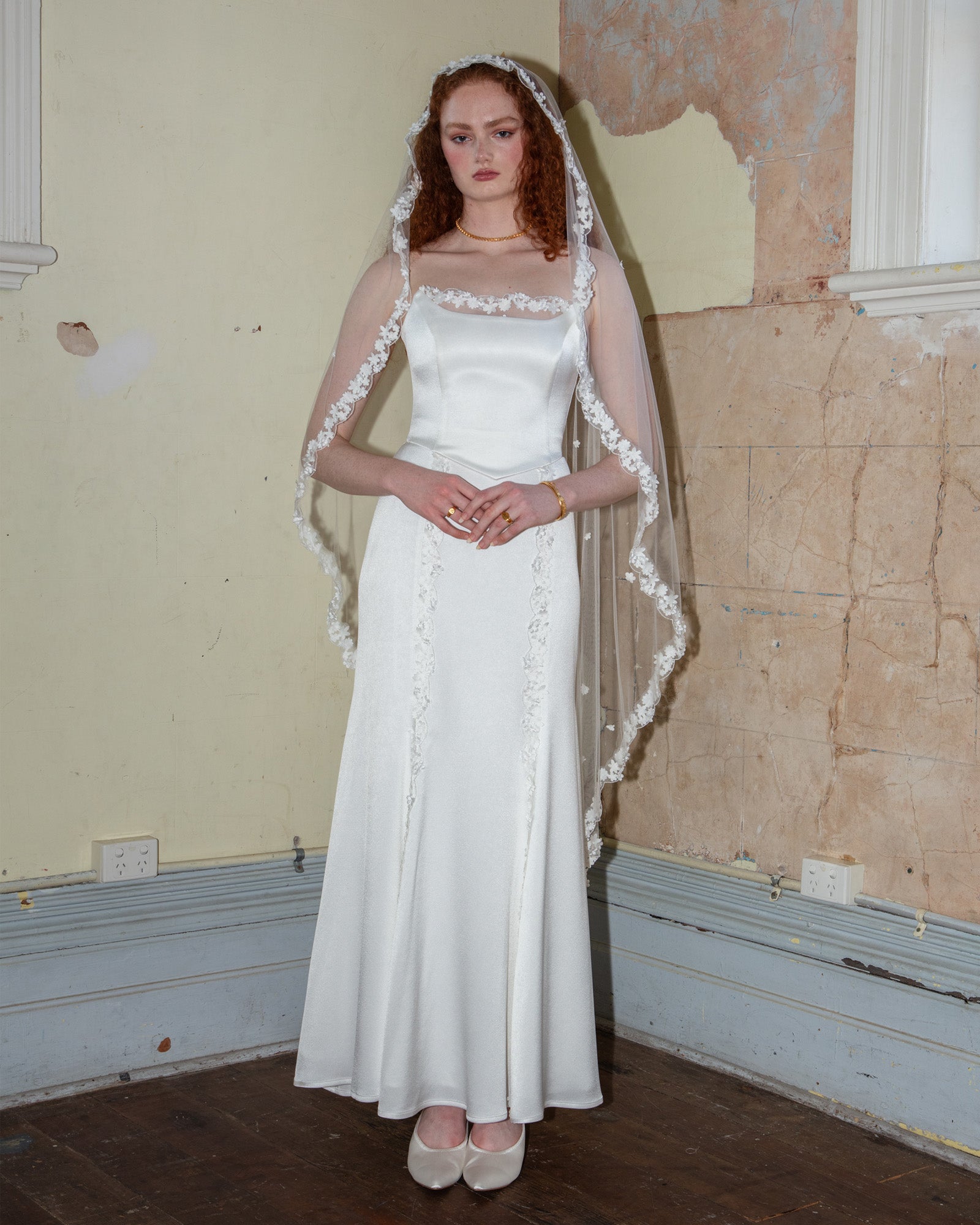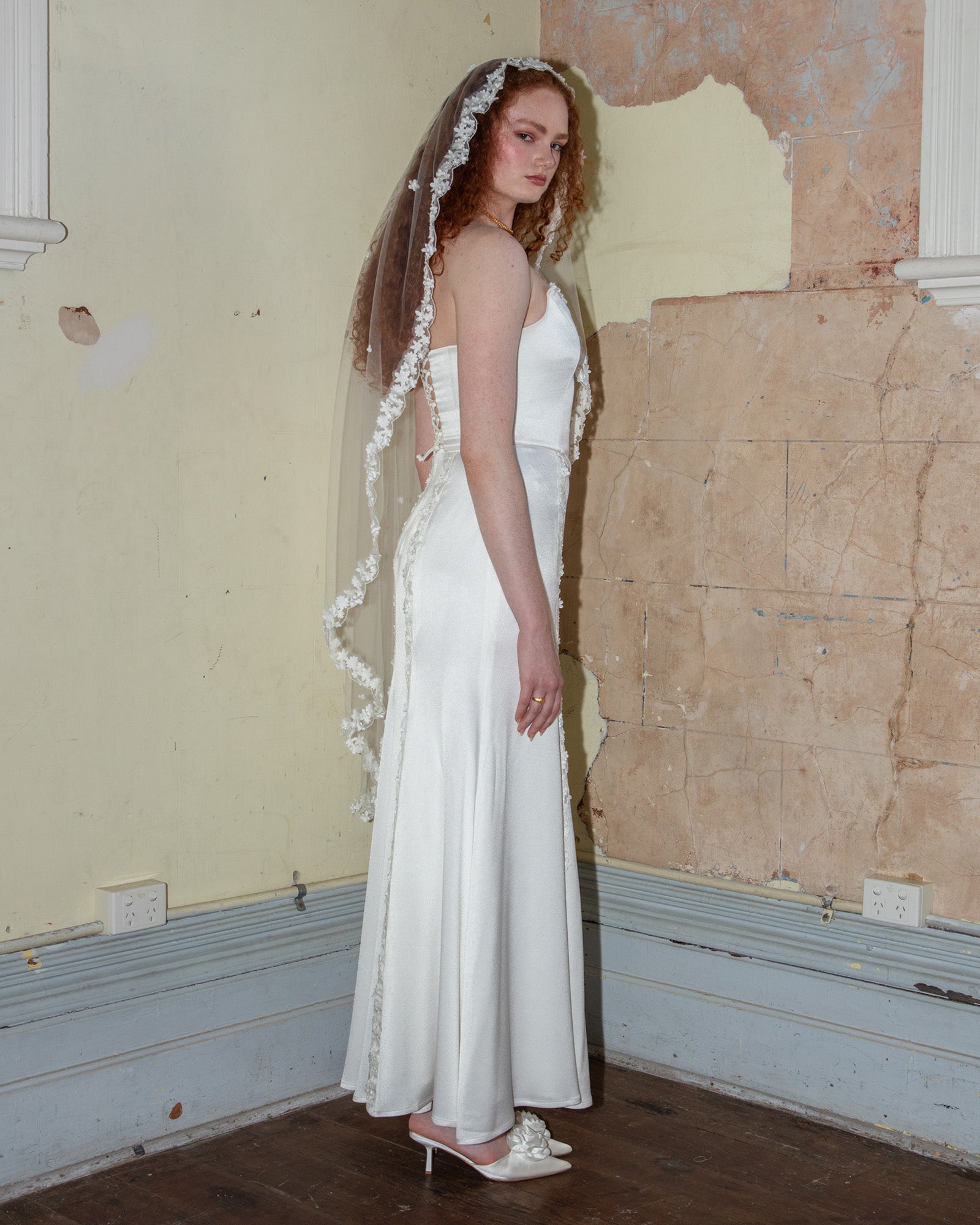 The Jaimee Corset doesn’t mess around—she’s all structure, style, and sass. Boning at the bust for shape, a soft pointed front, and trim across the chest give her that modern edge. The back? It’s all about that corset lacing, with rouleaux eyelets and a tie to cinch everything in just right. Worn here with the daisy variation of the Cherilyn Skirt and Maree Veil, Jaimee always brings the cool-girl vibes—however you style her, she’s the piece that speaks for itself.