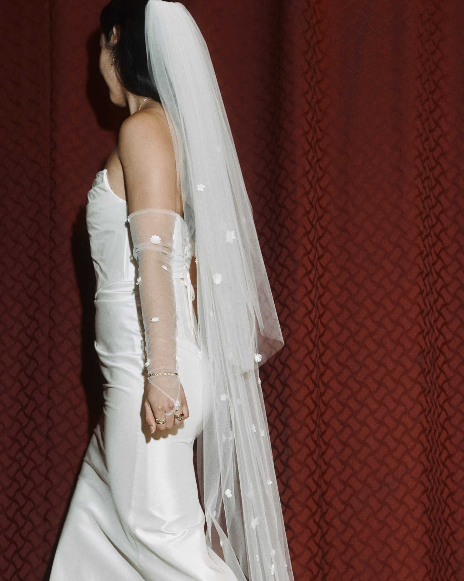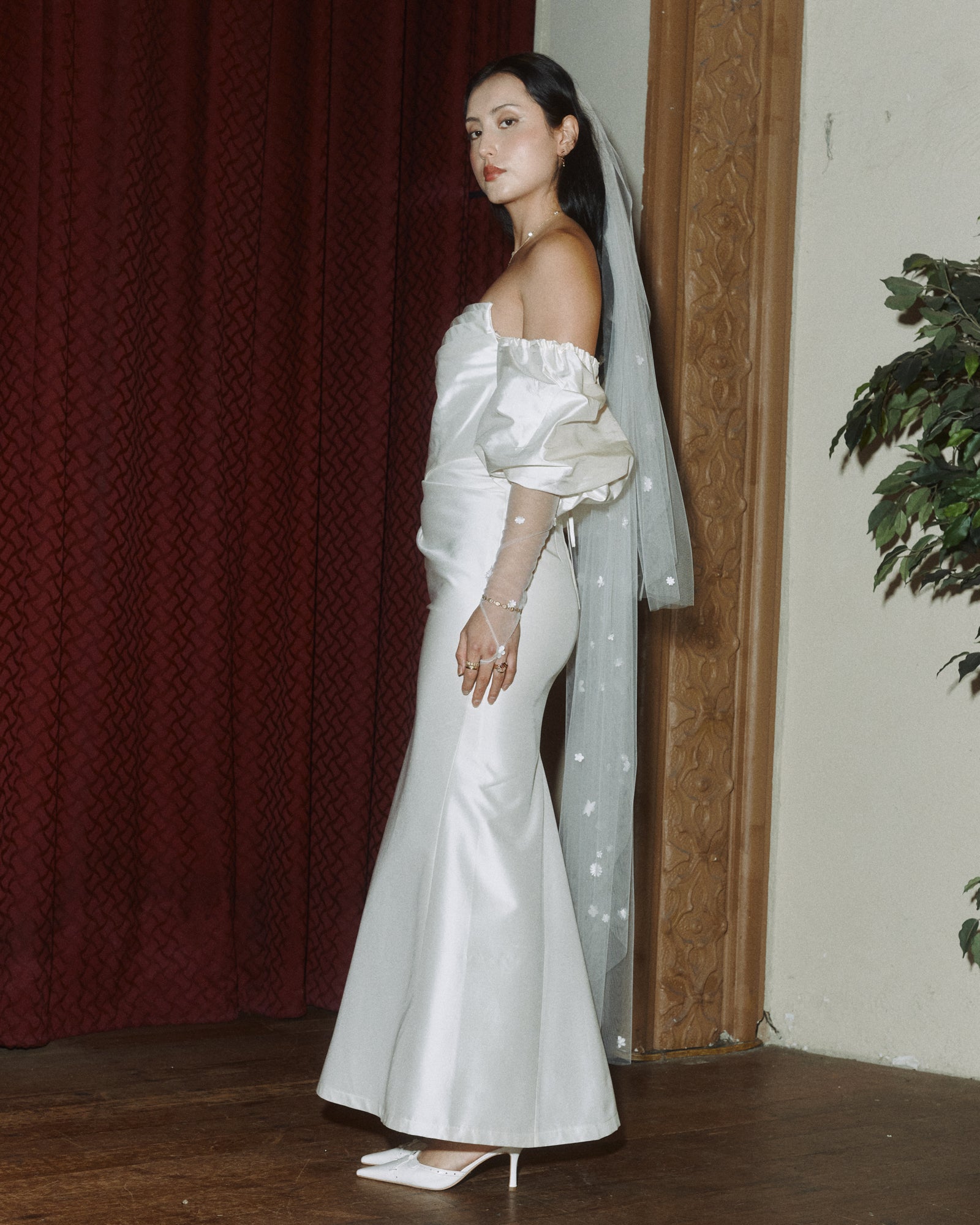 Cropped to pair effortlessly with all of our bottoms, Jasmine is shown here with the Lillian Dupion Skirt and layered with our Billy Sleeves, Daisy Gloves finished with our Daisy Veil. She also styles beautifully with the Athina Mini in Dupion alongside the Daisy Gloves and Heidi Neckscarf — a playful, polished mix for receptions and parties.