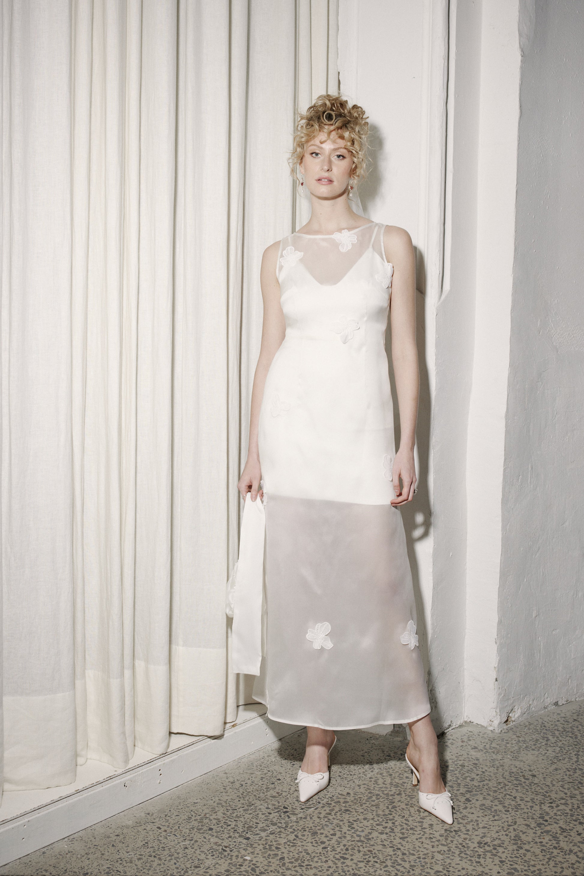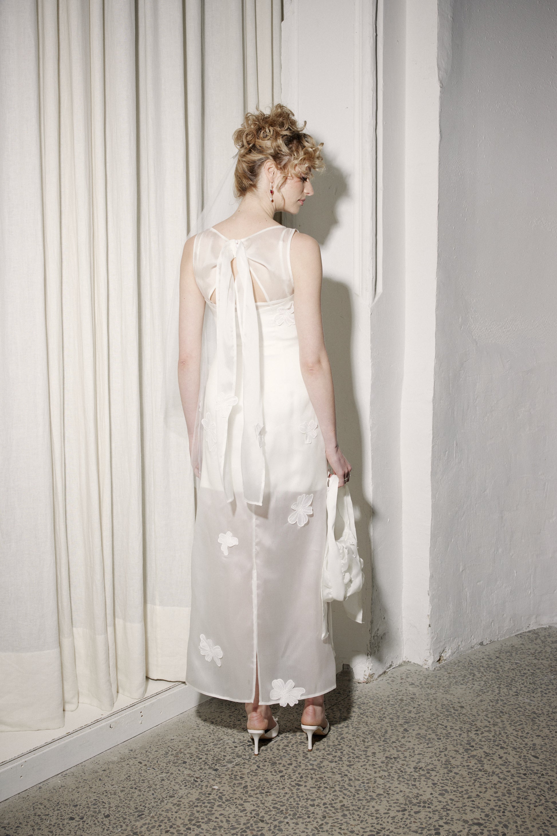 Scattered with hand-sewn, cosmos-style flowers, she closes with an invisible zipper at the centre-back..