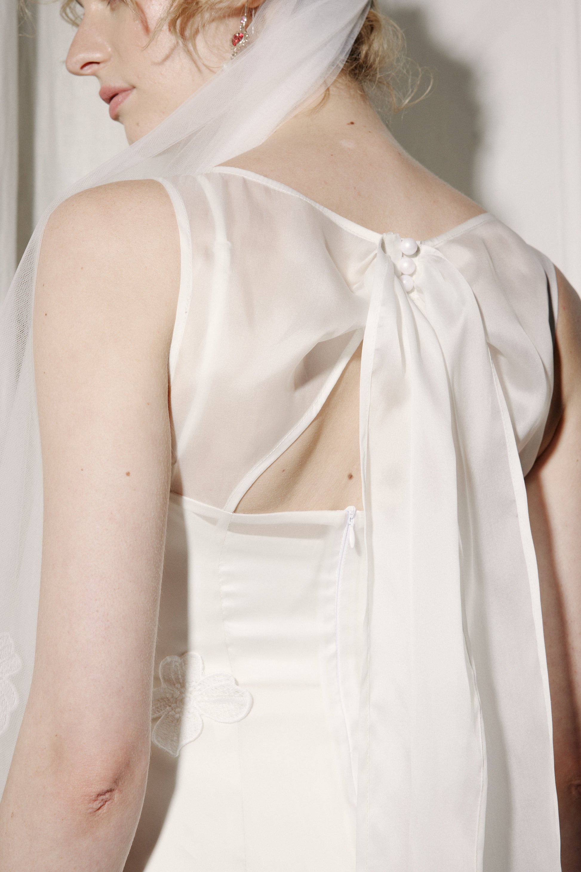 The Julia Dress cuts a sleek and chic silhouette. A slight A-line shape with a clean boat neck in the front, Julia features a gathered, open back panel with organza ribbon ties and a pearly button closure at the centre back neck.