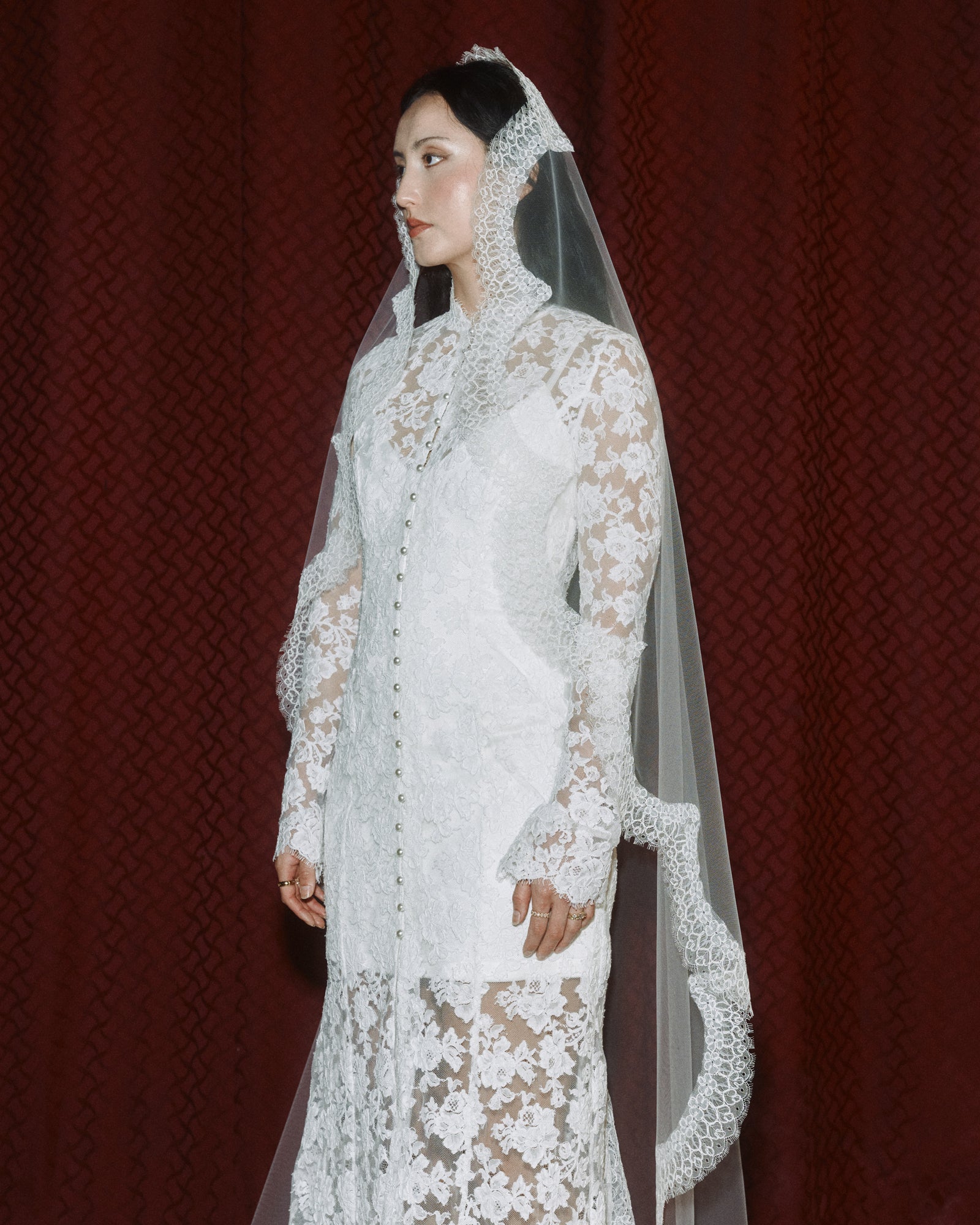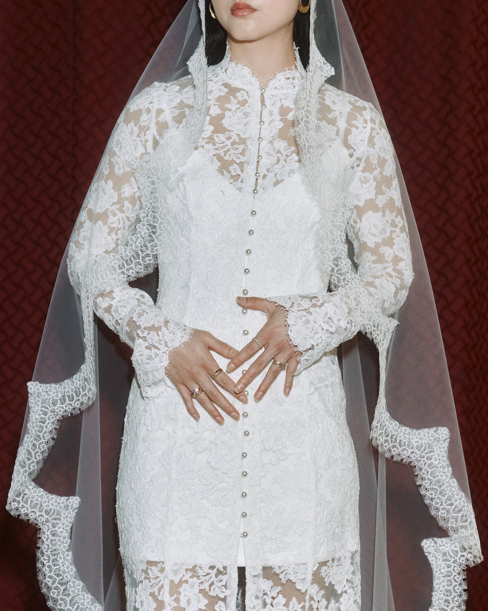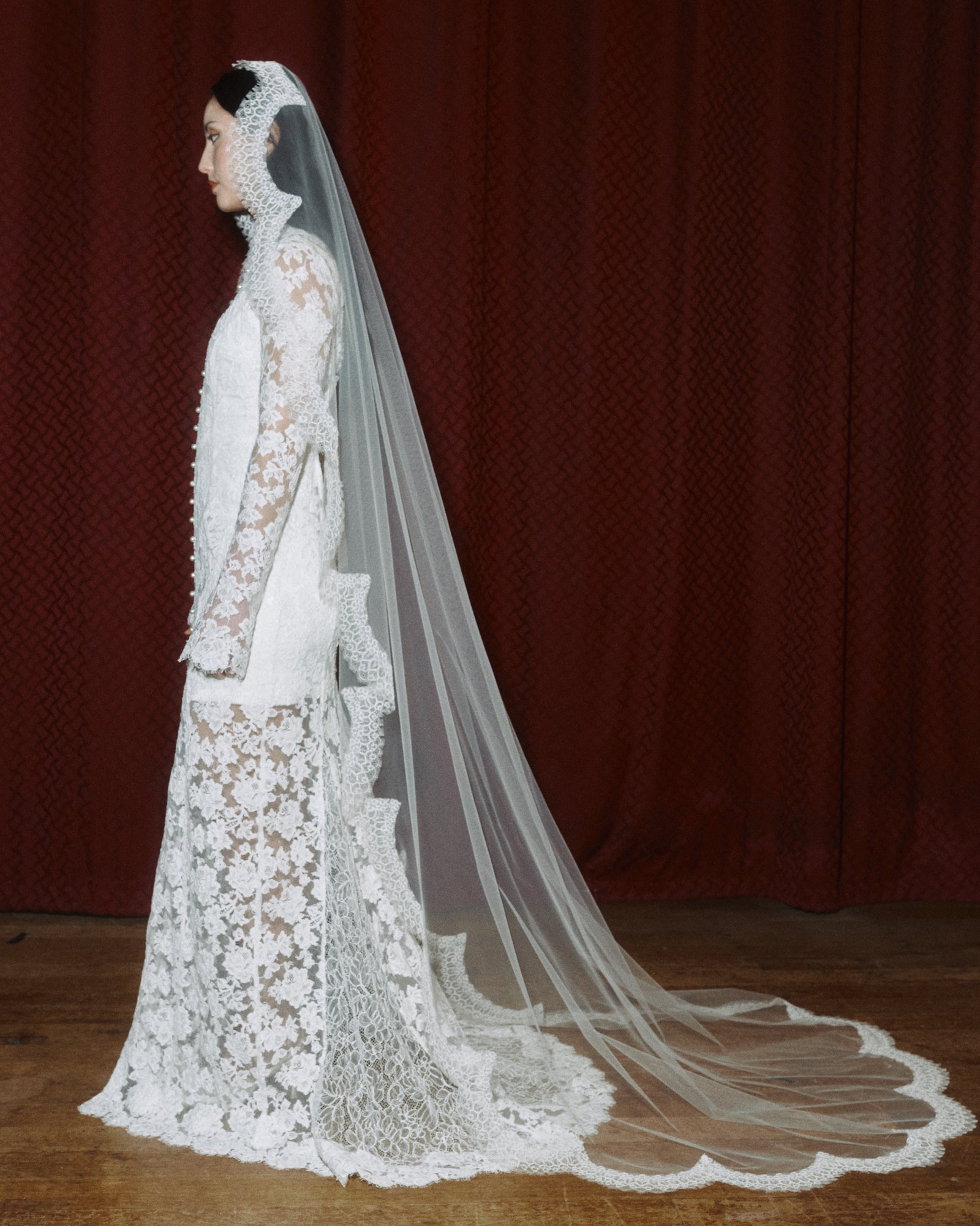 This Maree Veil is a mantilla-style veil cut in a long, cathedral-inspired length, she drapes to the floor with that easy, romantic kind of drama.