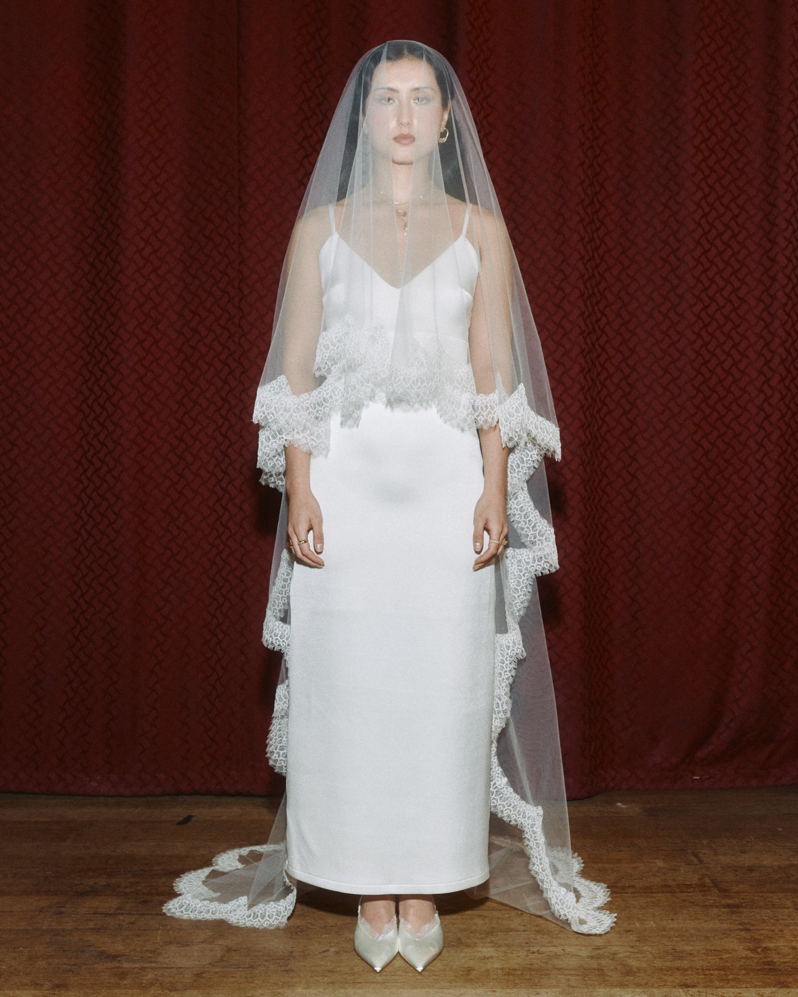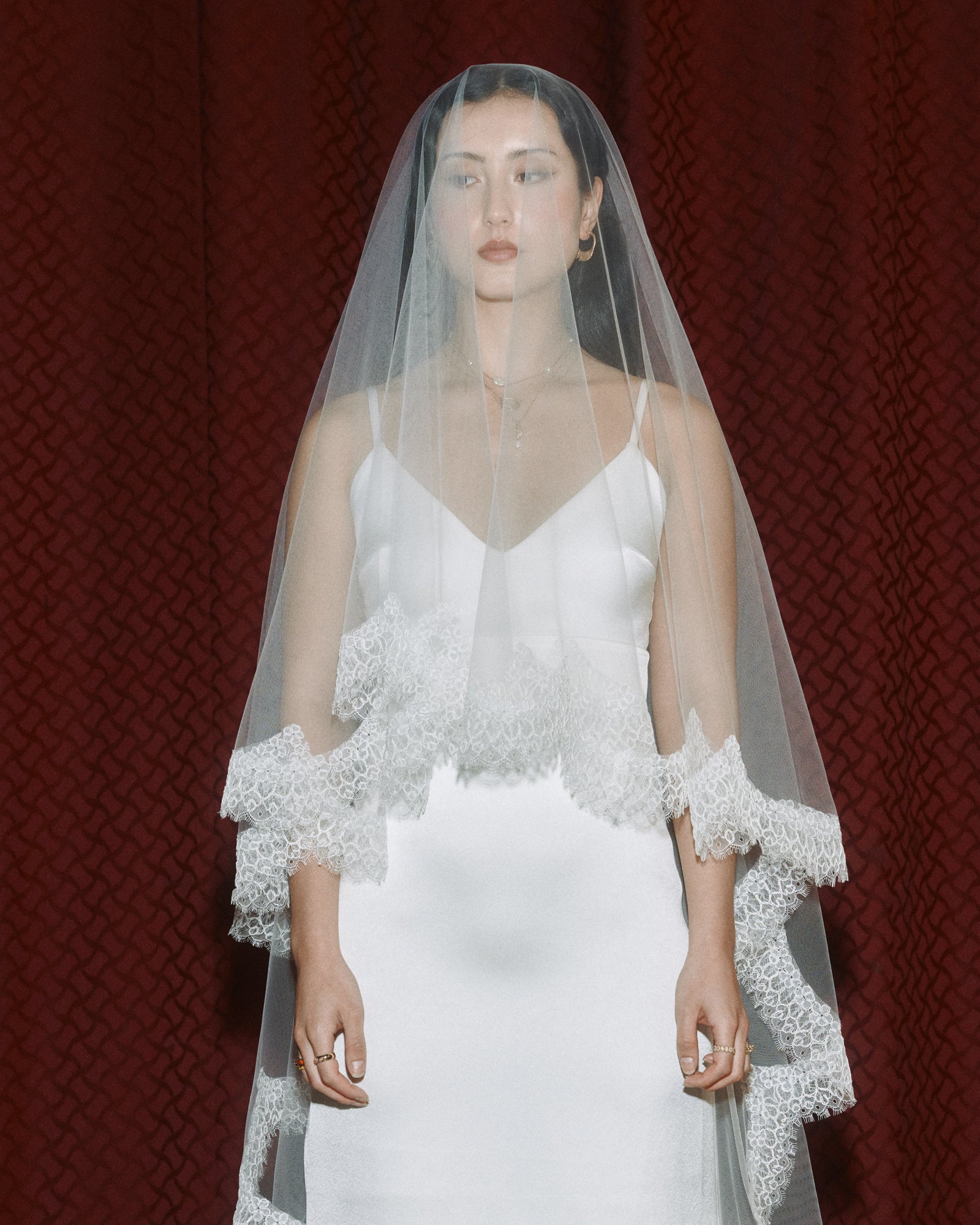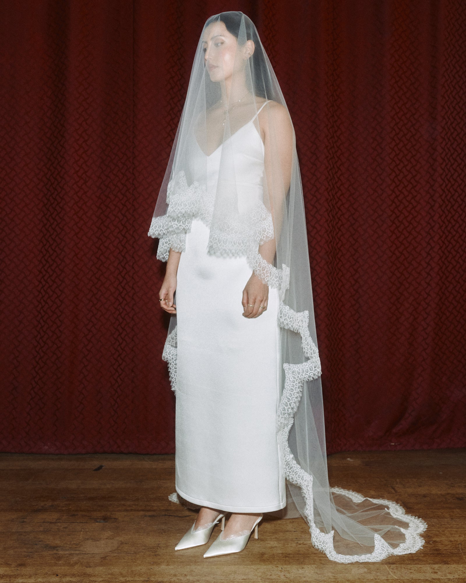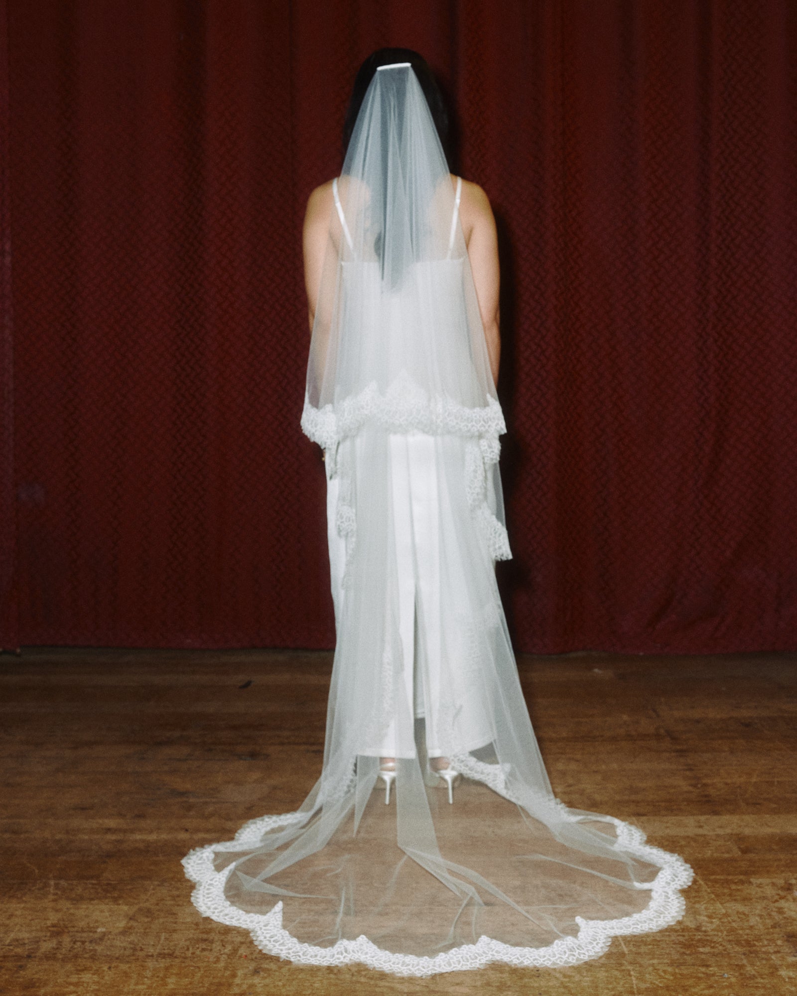 A variation of our beloved Aleisha Veil, the Mikaela Veil is a drop-style veil with a soft blusher secured by a discreet comb. Cut in a long, cathedral-inspired length, she drapes to the floor with that easy, romantic kind of drama.