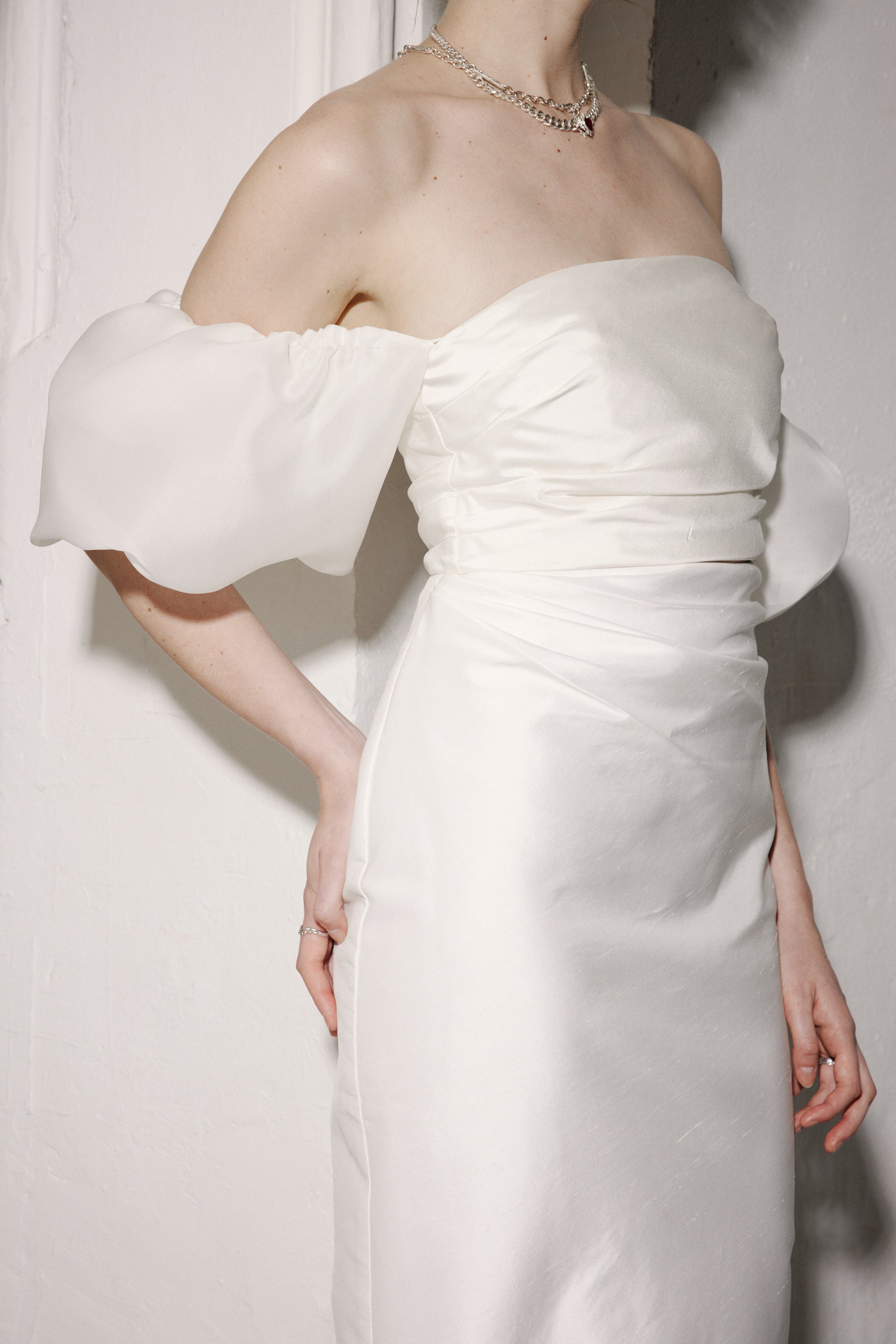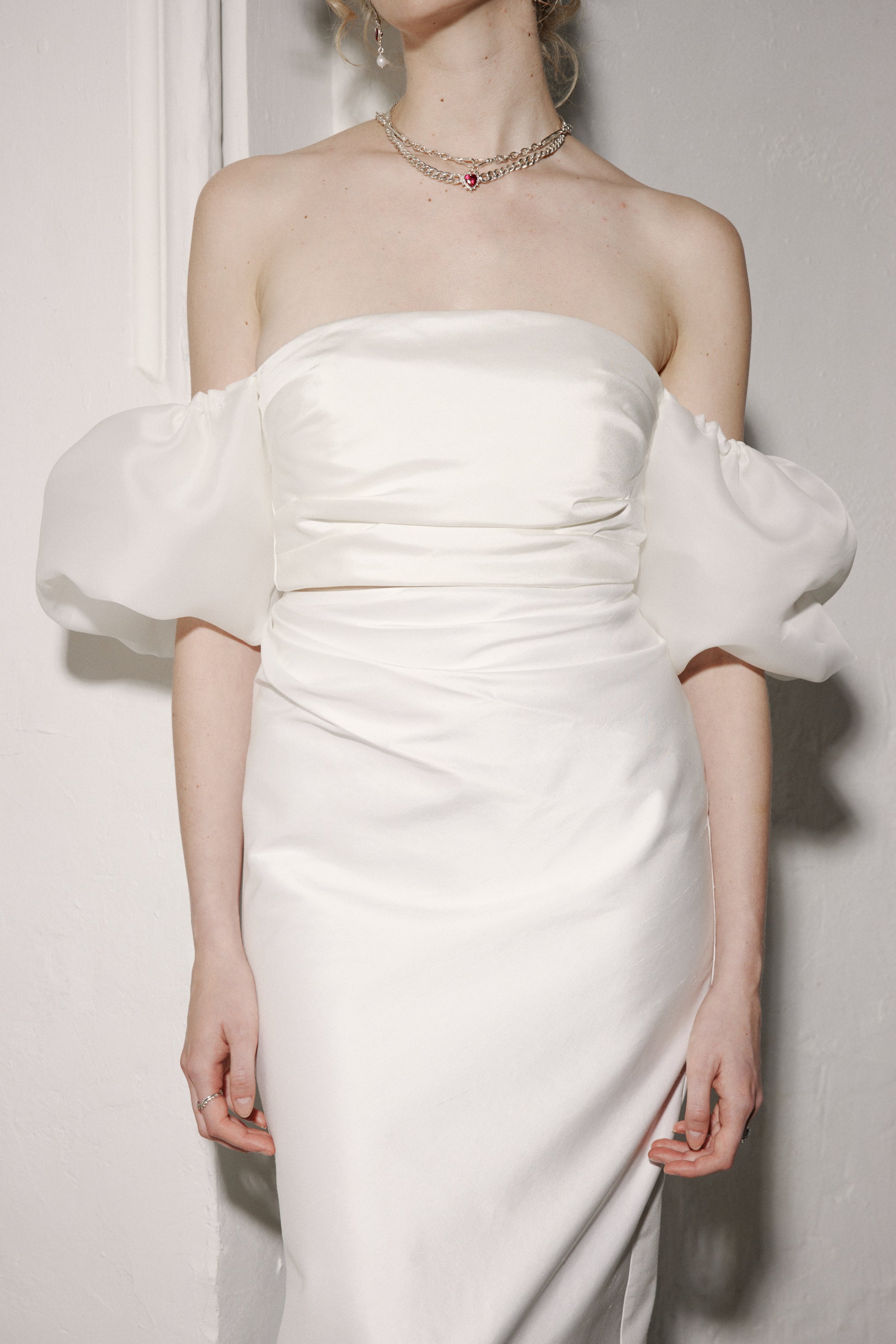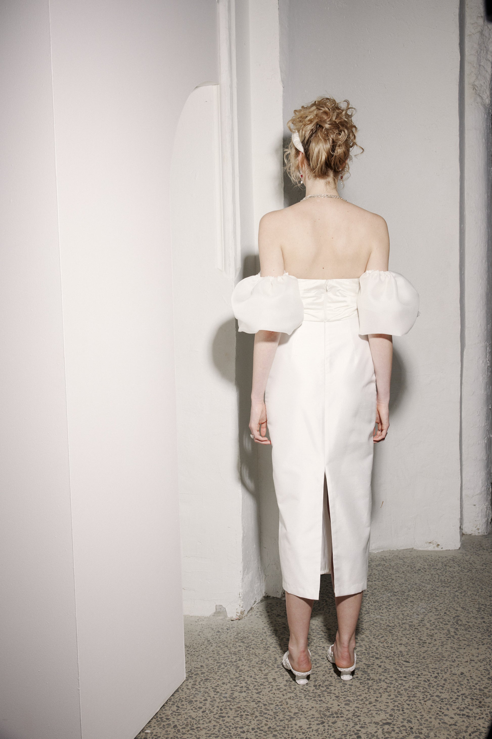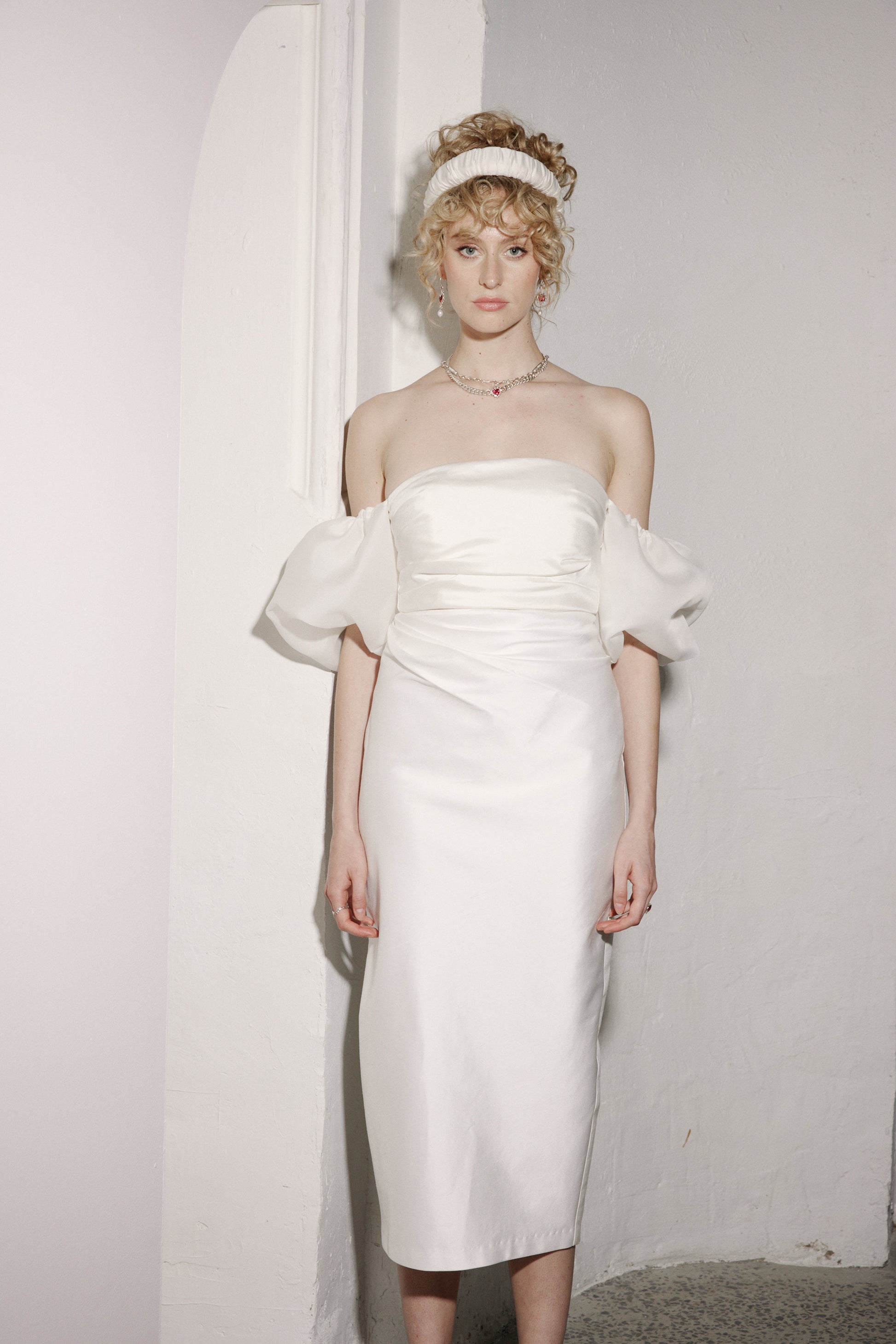 A slightly shorter version of our Billy Sleeves, they are designed to be worn with the Sylvia Bustier, Sylvia Dress, Athina Mini Dress and Athina Midi Dress. The off-shoulder balloon sleeve is attached at the underarm point with hidden rouleaux loops and buttons.