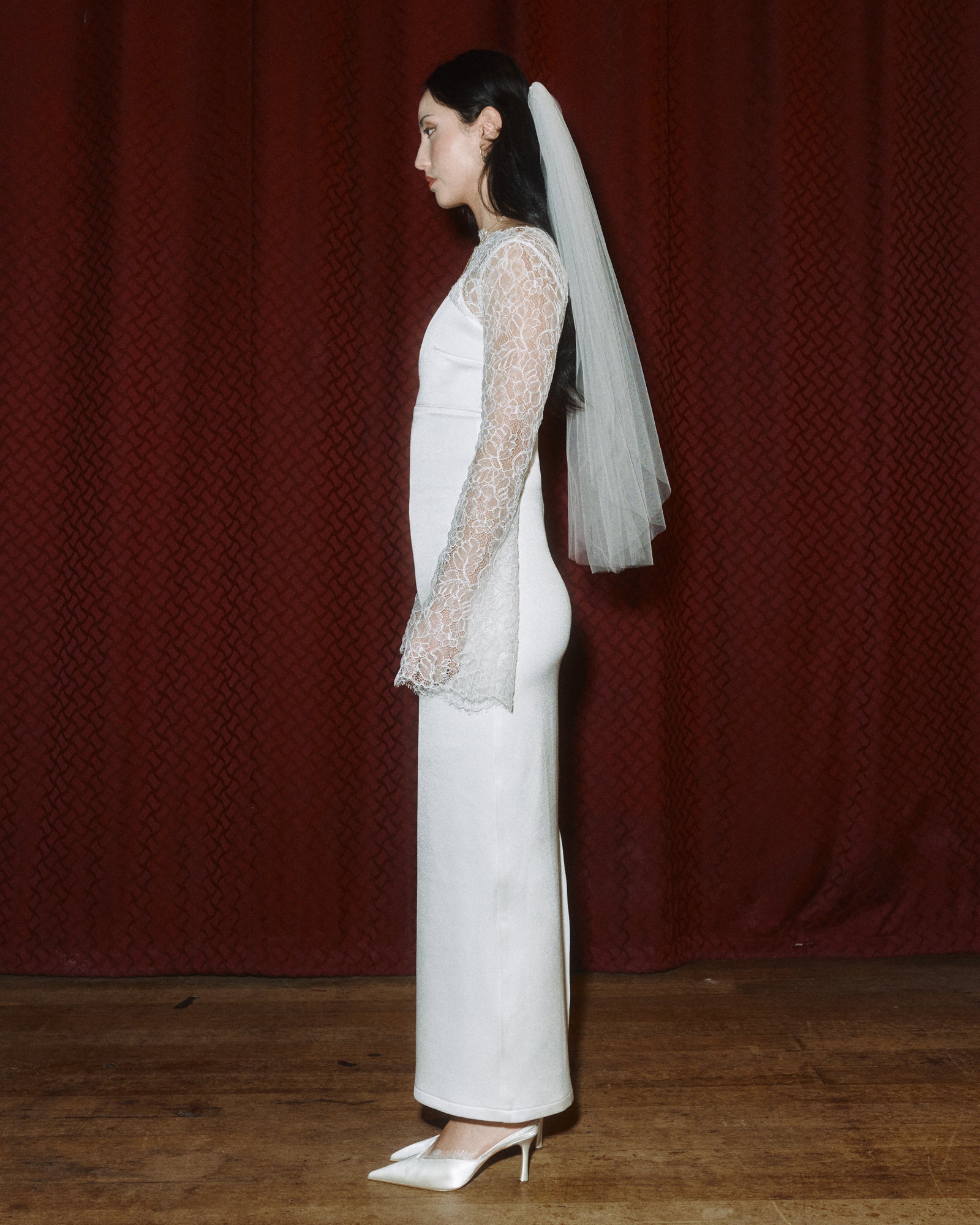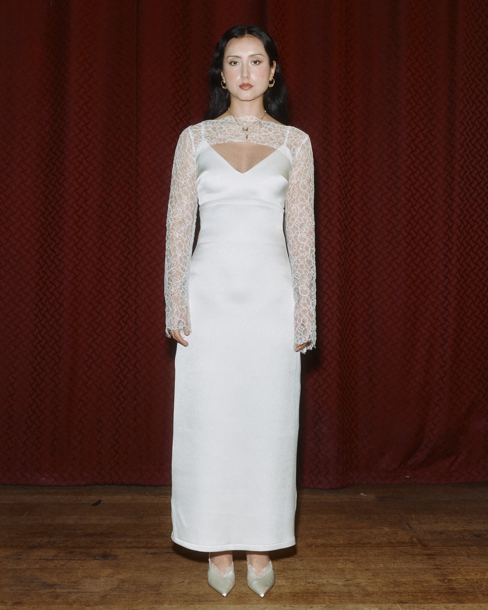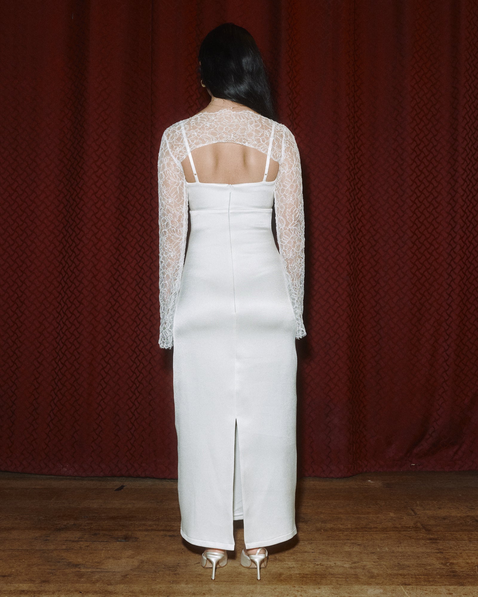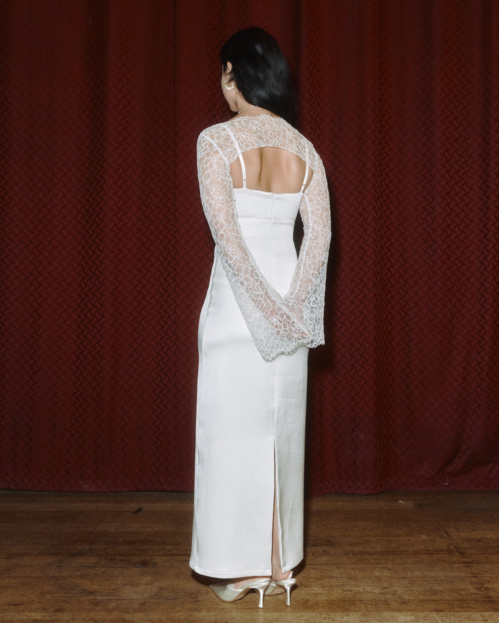 Cropped to sit neatly over our slips and corsets, Robin has long, gently flared sleeves that add movement and softness without stealing the show. Worn here with the Tania Midi, she pairs effortlessly with all of our lace pieces — we especially love her with Jasmine — and looks just as striking layered over any of our simpler, non-lace styles.