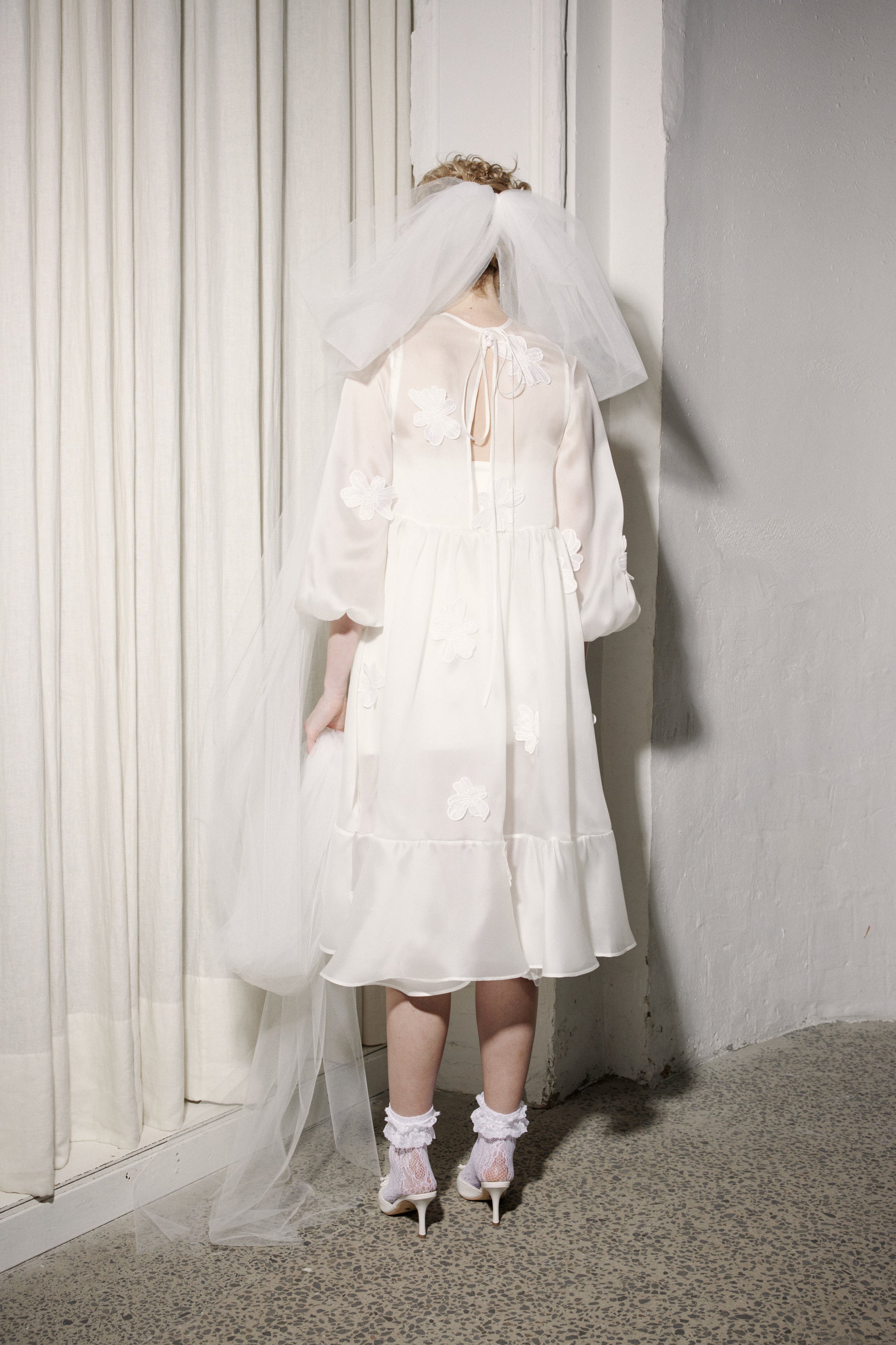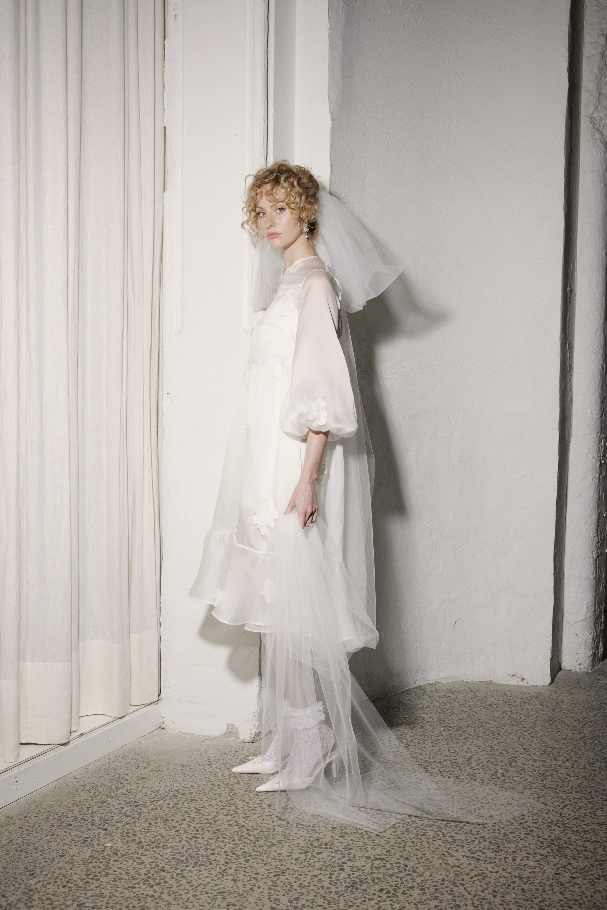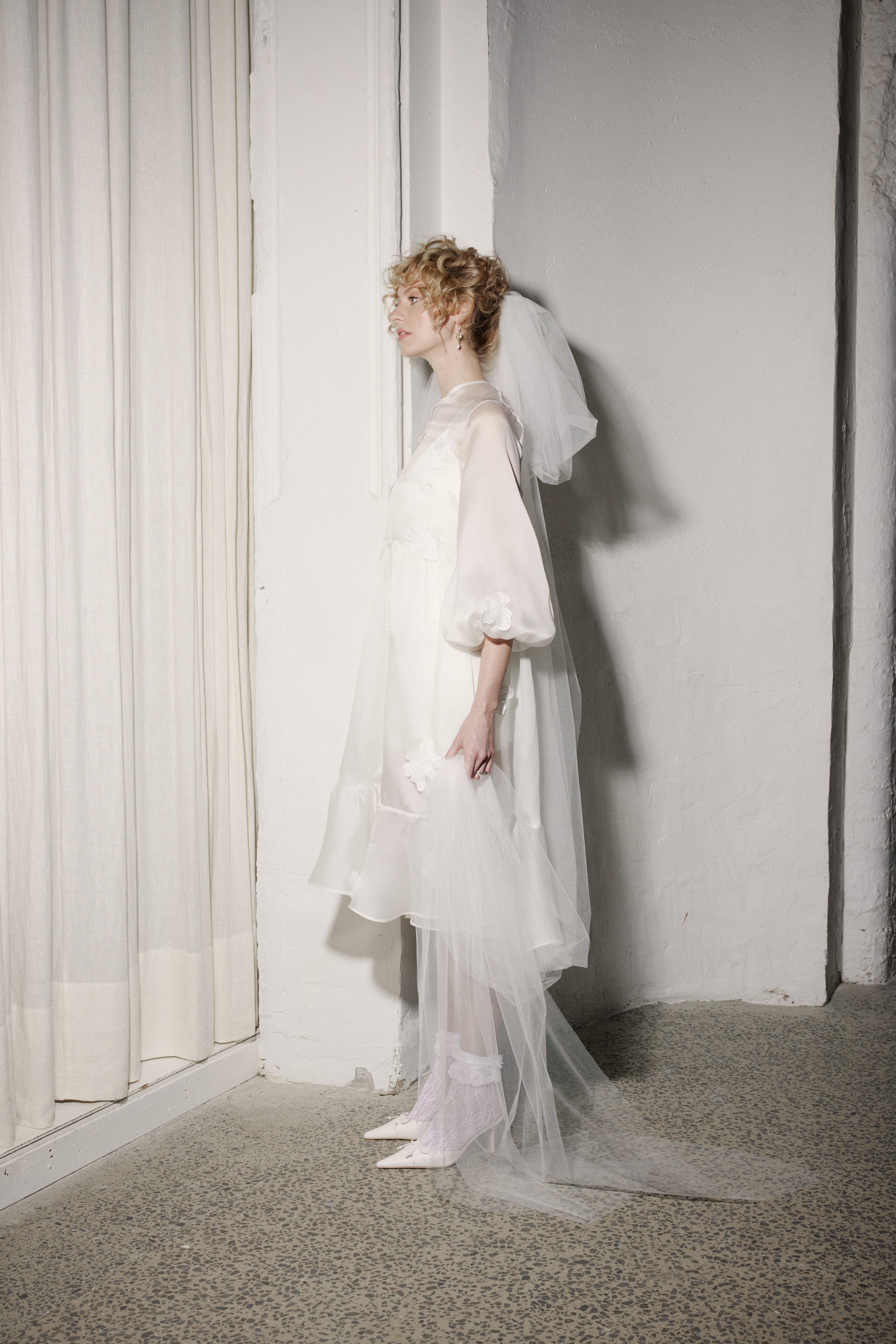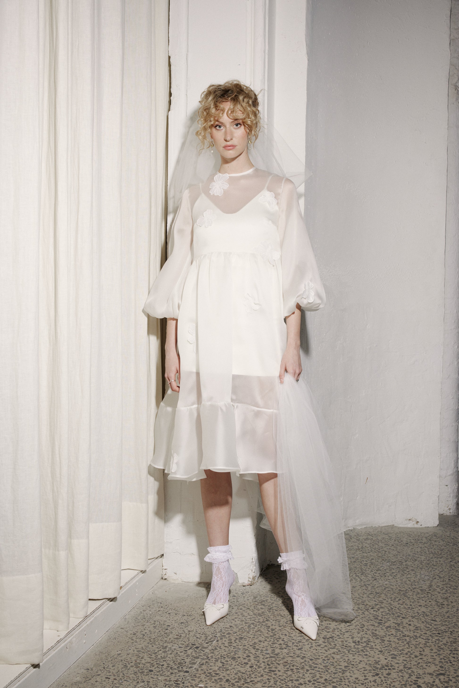 One of our very first Honeymoon styles has been updated and improved! Sophie is a sweet little thing with an oversized fit. Detailed with exaggerated sleeves and a ruffle around the bottom hem, she has a partially open back that fastens with a button at the centre top neck. Sophie is scattered with hand-sewn cosmos-style flower flourishes.