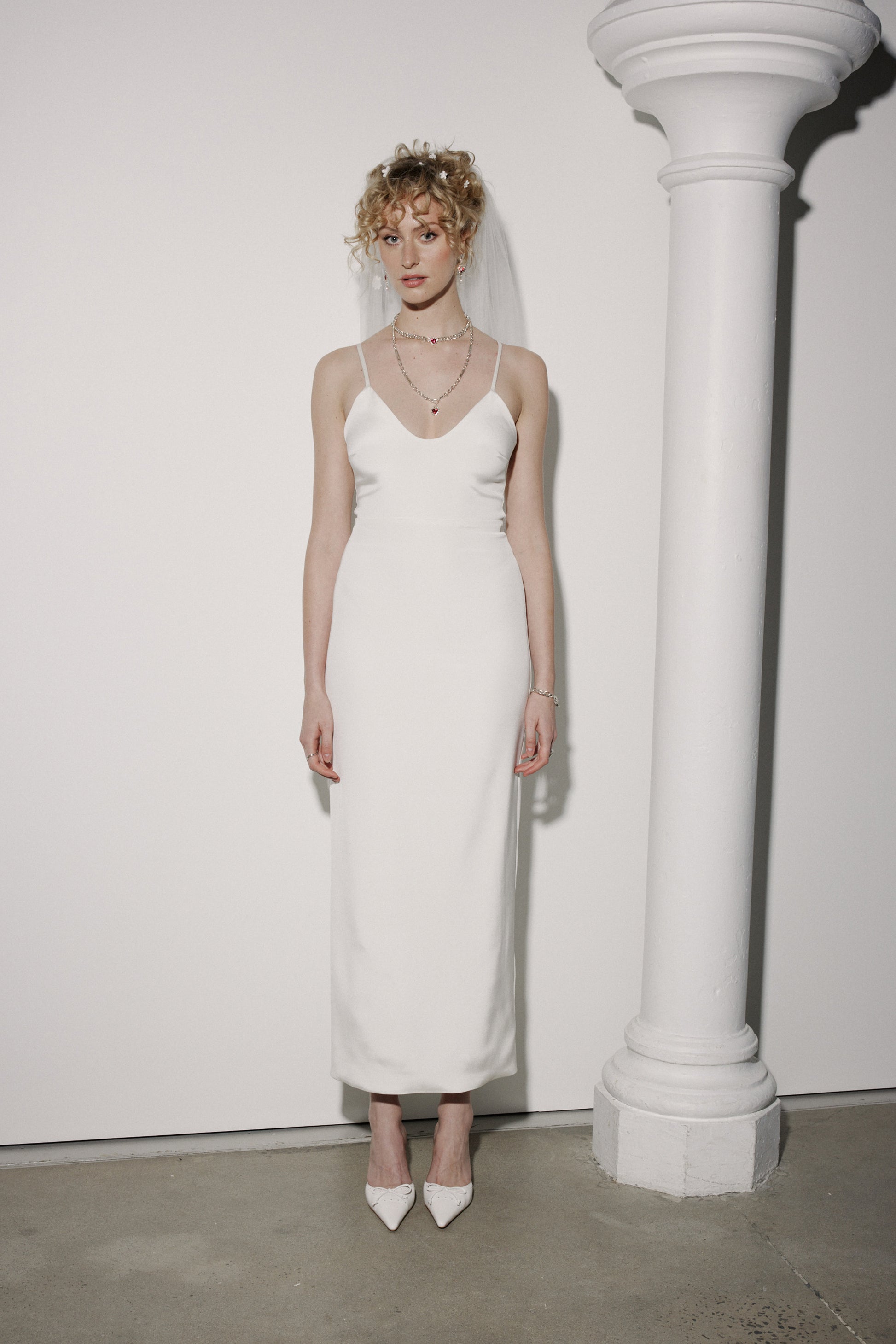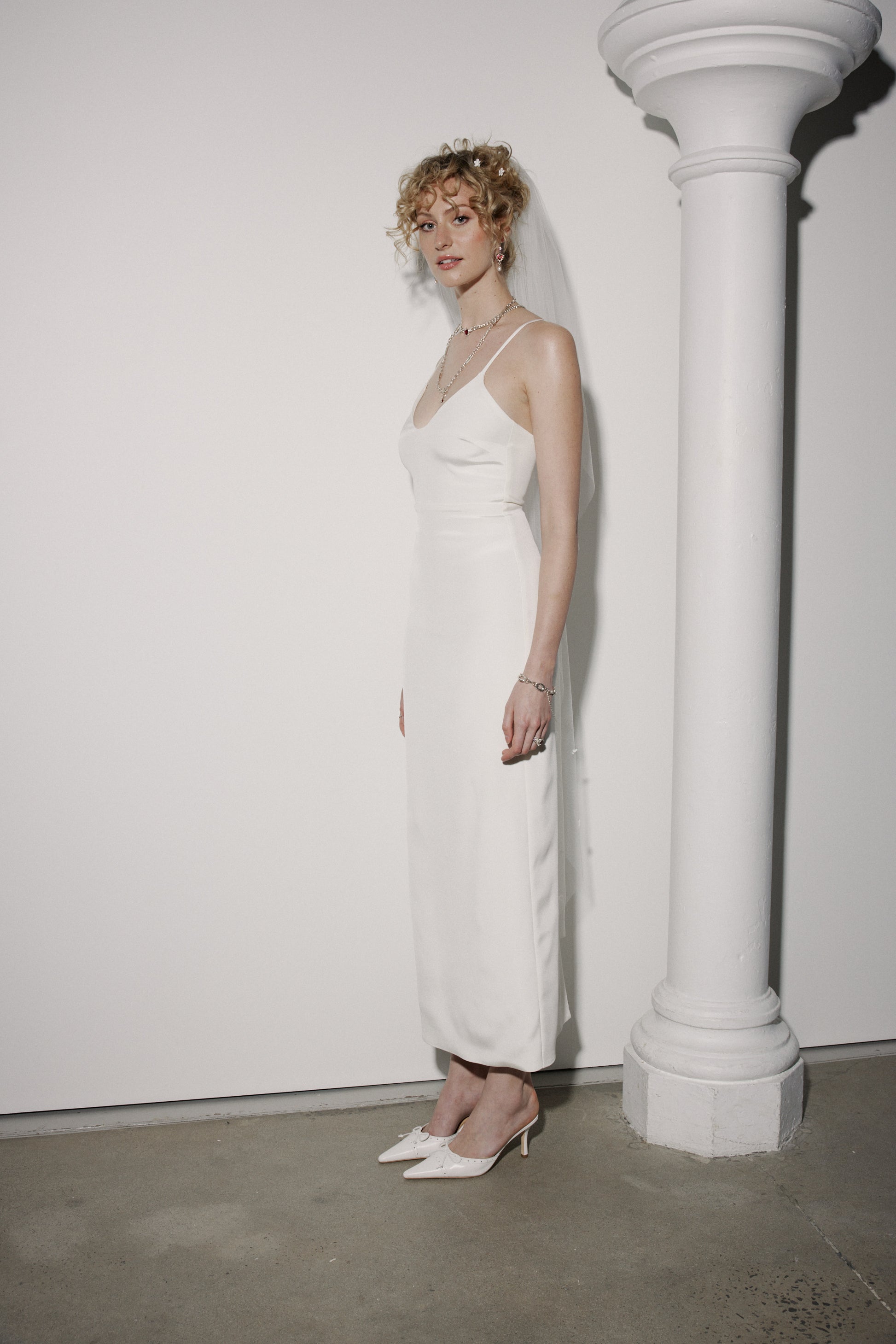 The Tabitha Slip is a fully lined, figure hugging slip dress with a plunging neckline, high-thigh slit and adjustable straps. She's designed to sit seamlessly under any of our sheer midi dresses like the Grace, Kalu, Julia or Penny, or wear her stripped back on her own for a saucy moment.Worn here with the Daisy Veil.