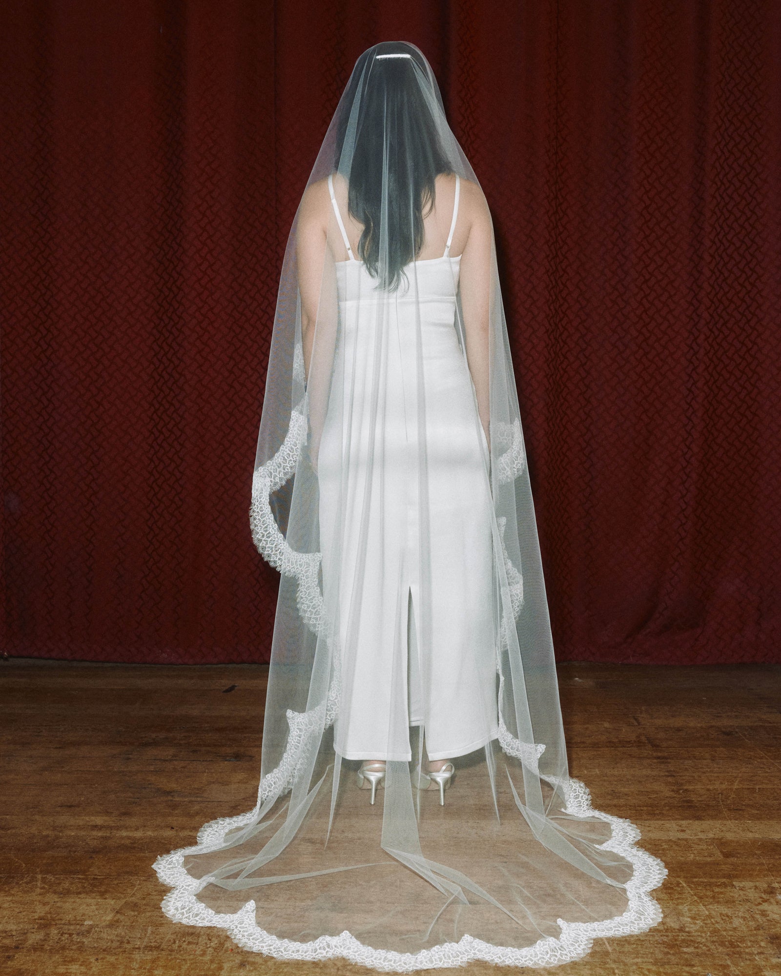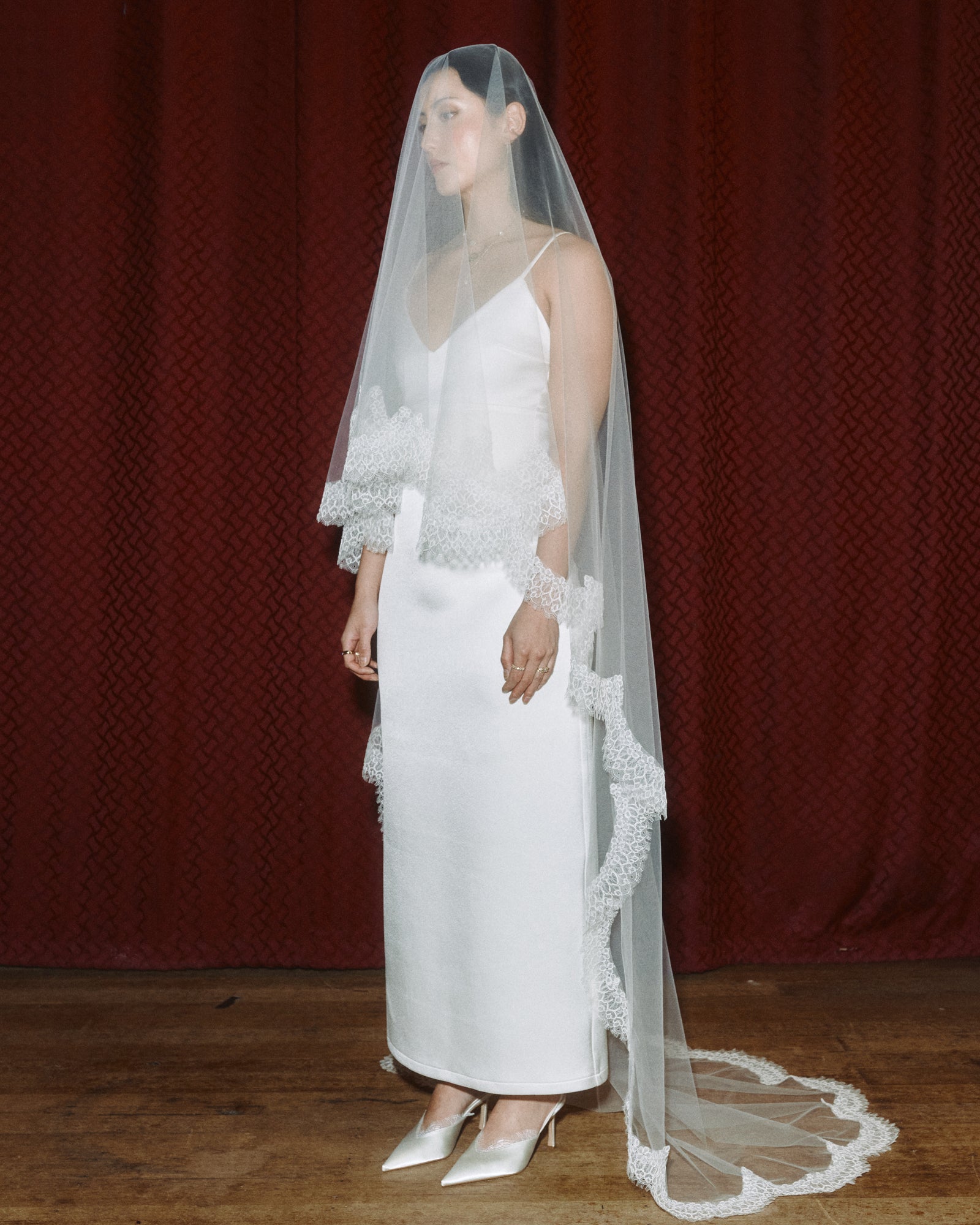 Still perfect for layering under our sheer lace and midi styles, Tania also works beautifully on her own as a stand-alone dress. Worn here with the Mikaela Lace Veil, she styles effortlessly with both lace-forward and more minimal styles.