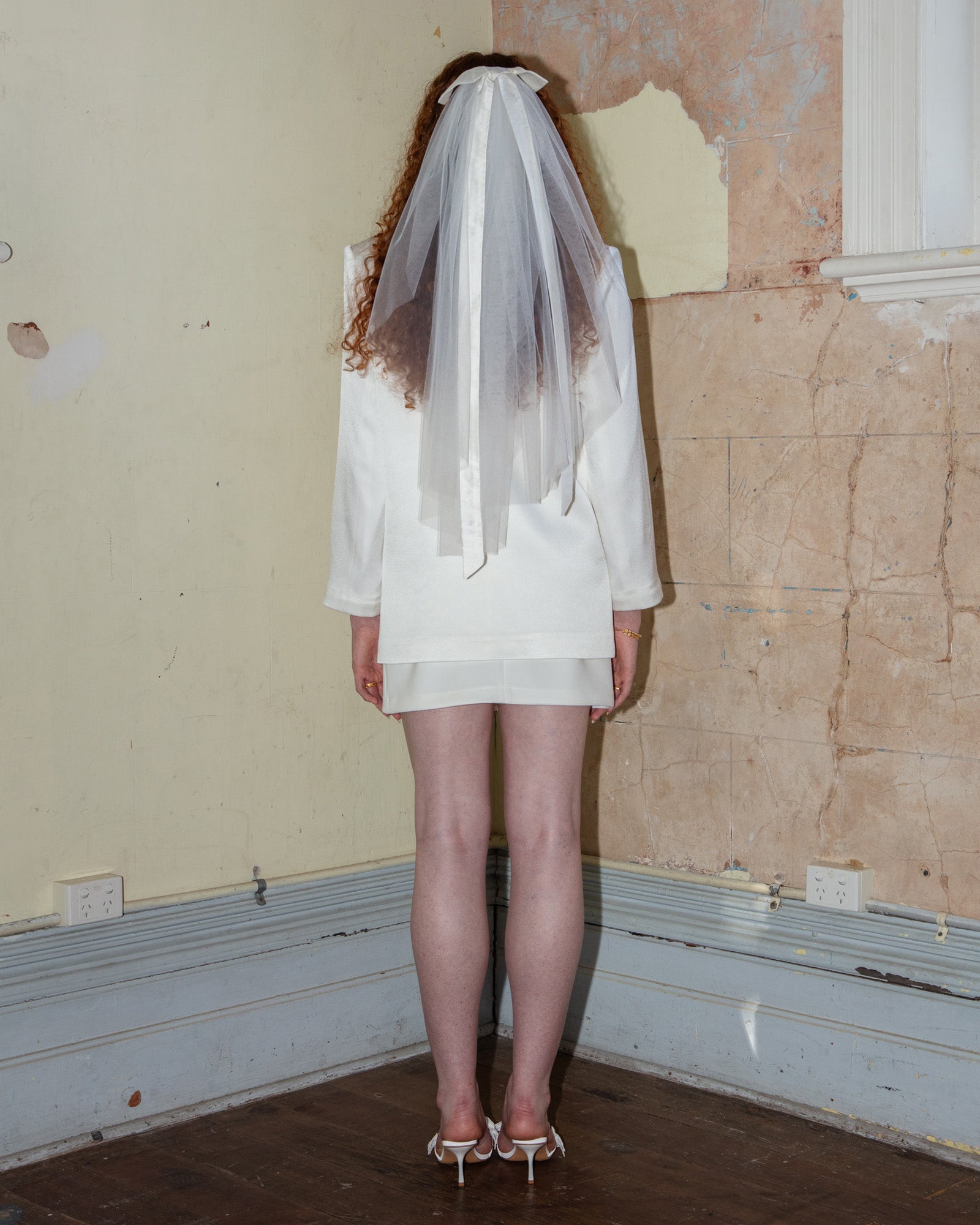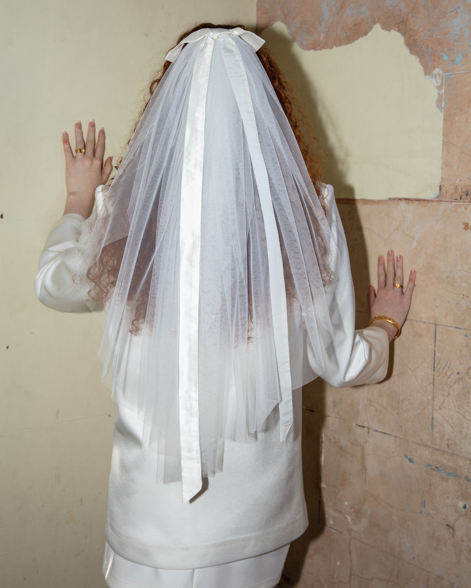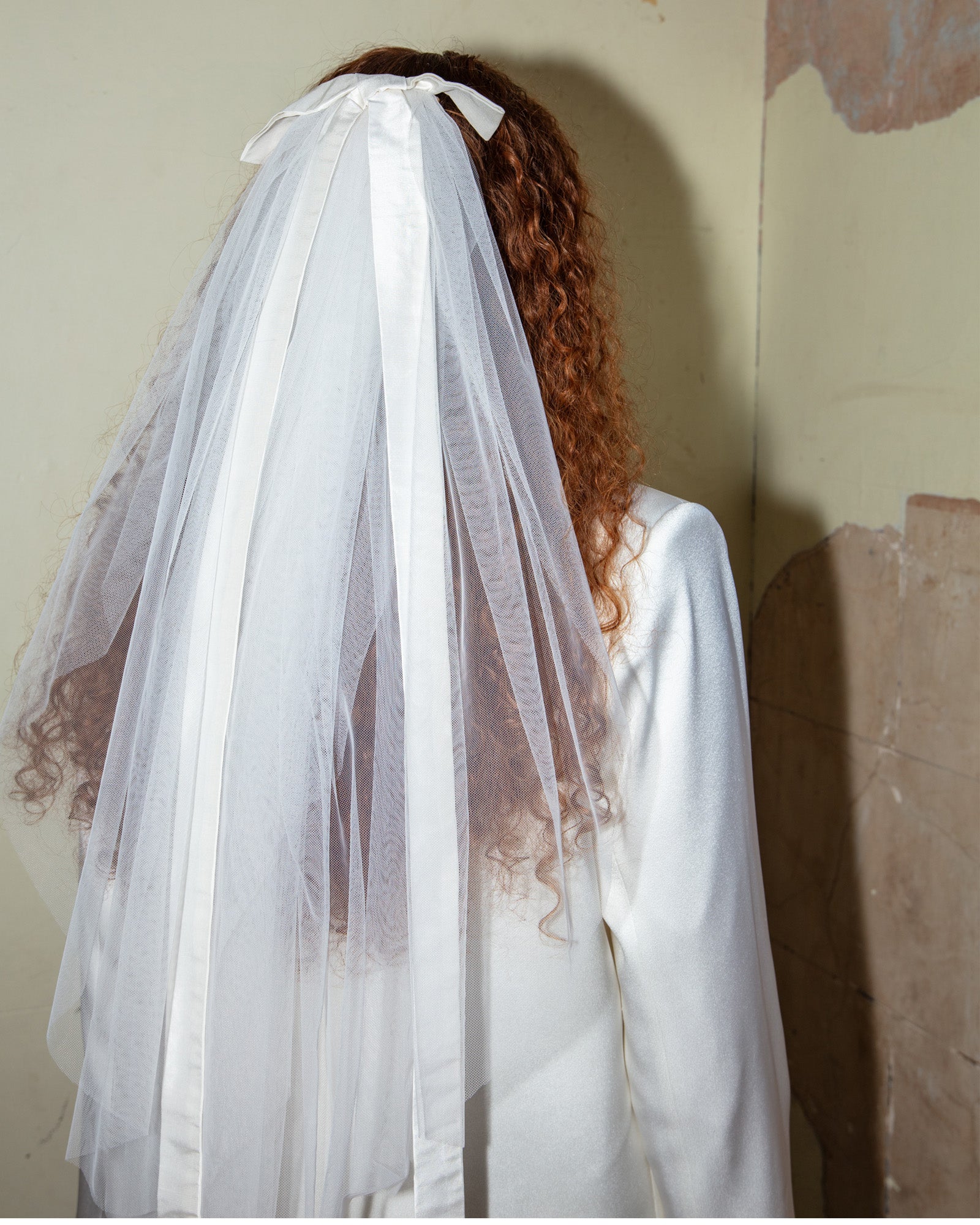A plain gathered tulle veil secured with a comb that falls around the mid-back point, featuring a silk dupion bow. A little bit traditional, and a little bit of fun!
