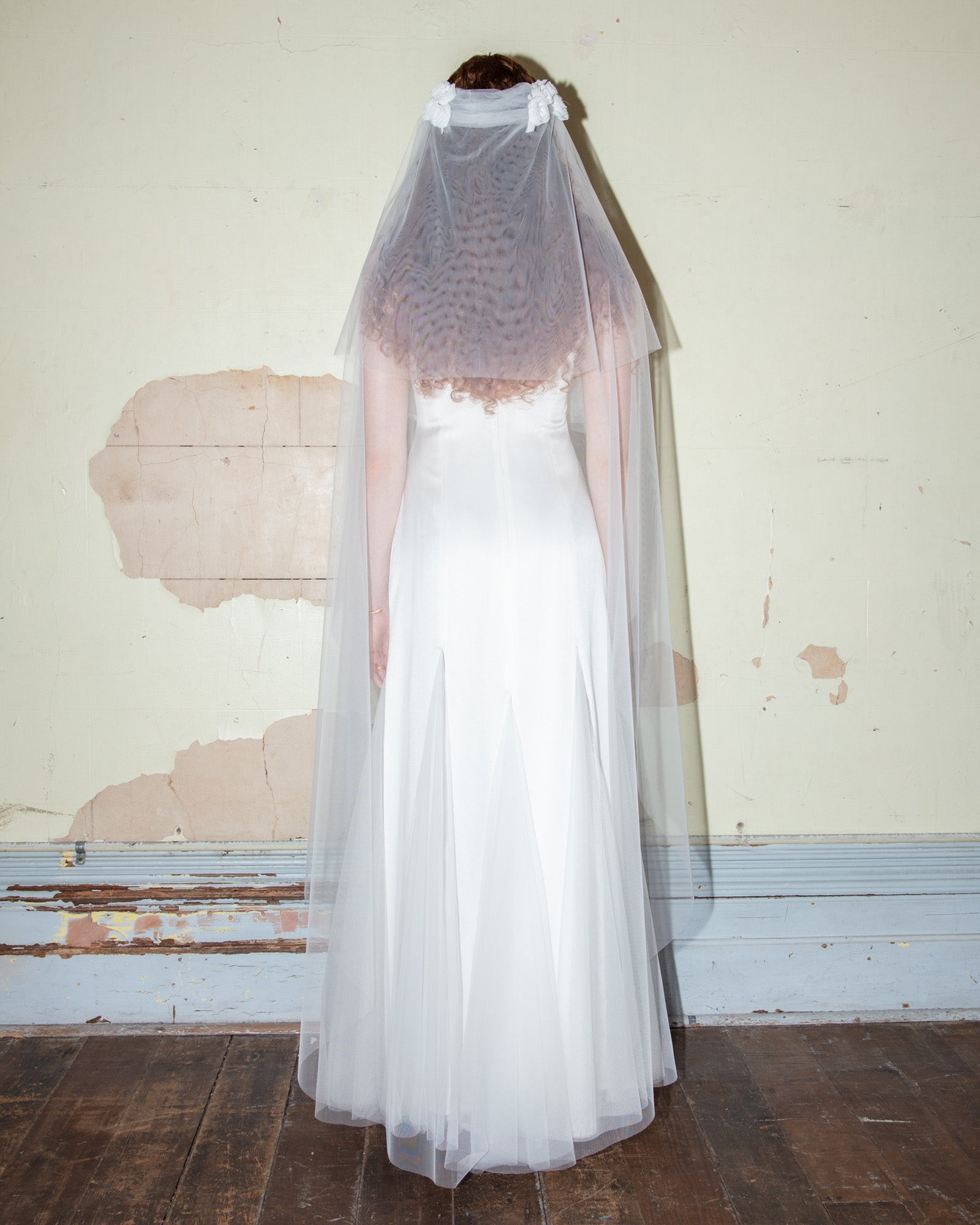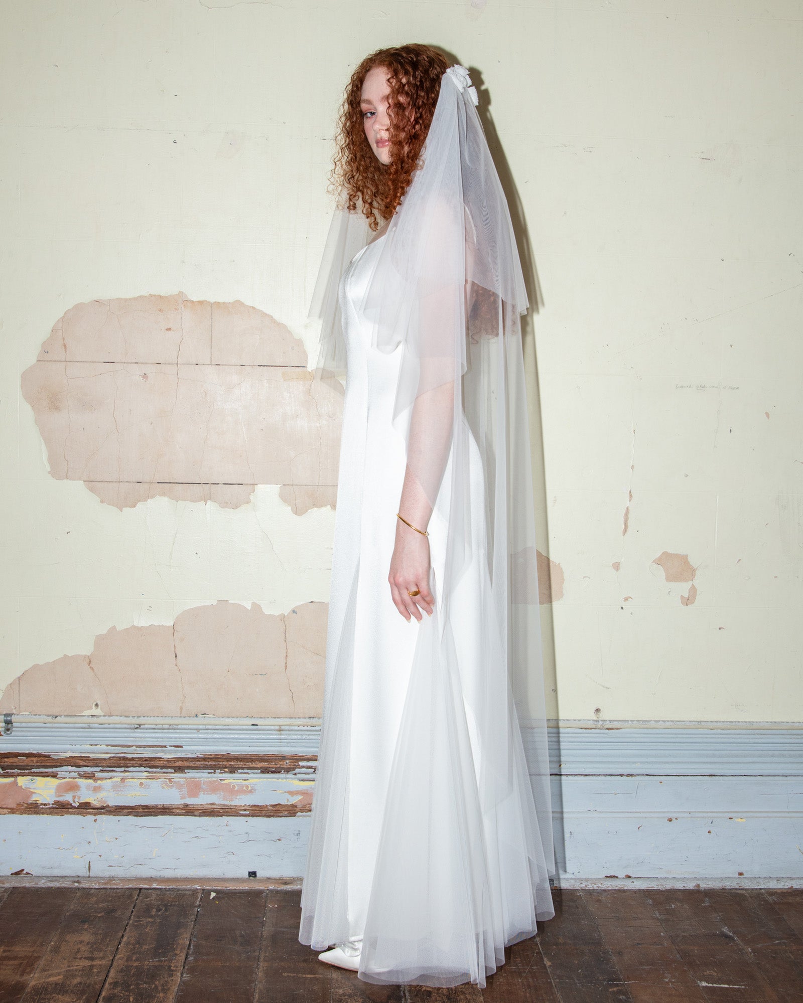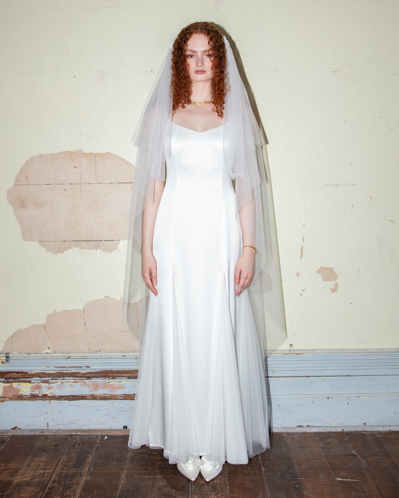 The Yvonne Slip Dress is here to steal the spotlight (and maybe a few hearts). With a soft sweetheart neckline, a fitted princess line, and a low back that brings the drama, she’s all about making an entrance. The exaggerated fit-and-flare silhouette gets a serious upgrade with contrast tulle godet inserts—because why not go big? Style her with the Scarlett Veil for a look that’s equal parts cool and unforgettable.